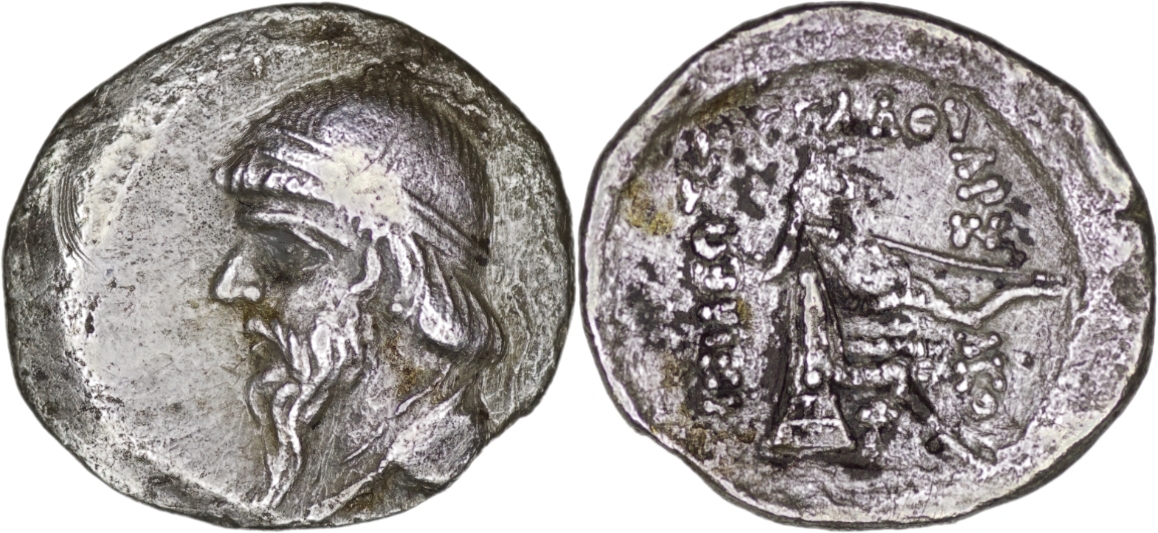 Parthian Empire. Mithradates I (171-132 BC). AR Drachm. (3.20g/ 20mm). Bearded bust left, wearing diadem; circular reel only border/ Beardless archer wearing bashlyk and cloak seated right on omphalos, holding bow in right hand; no border; three-line Greek inscription = ΒΑΣΙΛΕΩΣ ΜΕΓΑΛΟΥ ΑΡΣΑΚΟΥ. Sellwood 11.1. Very fine.