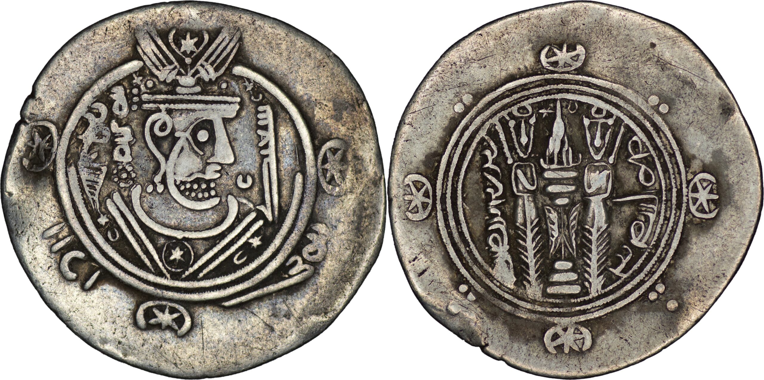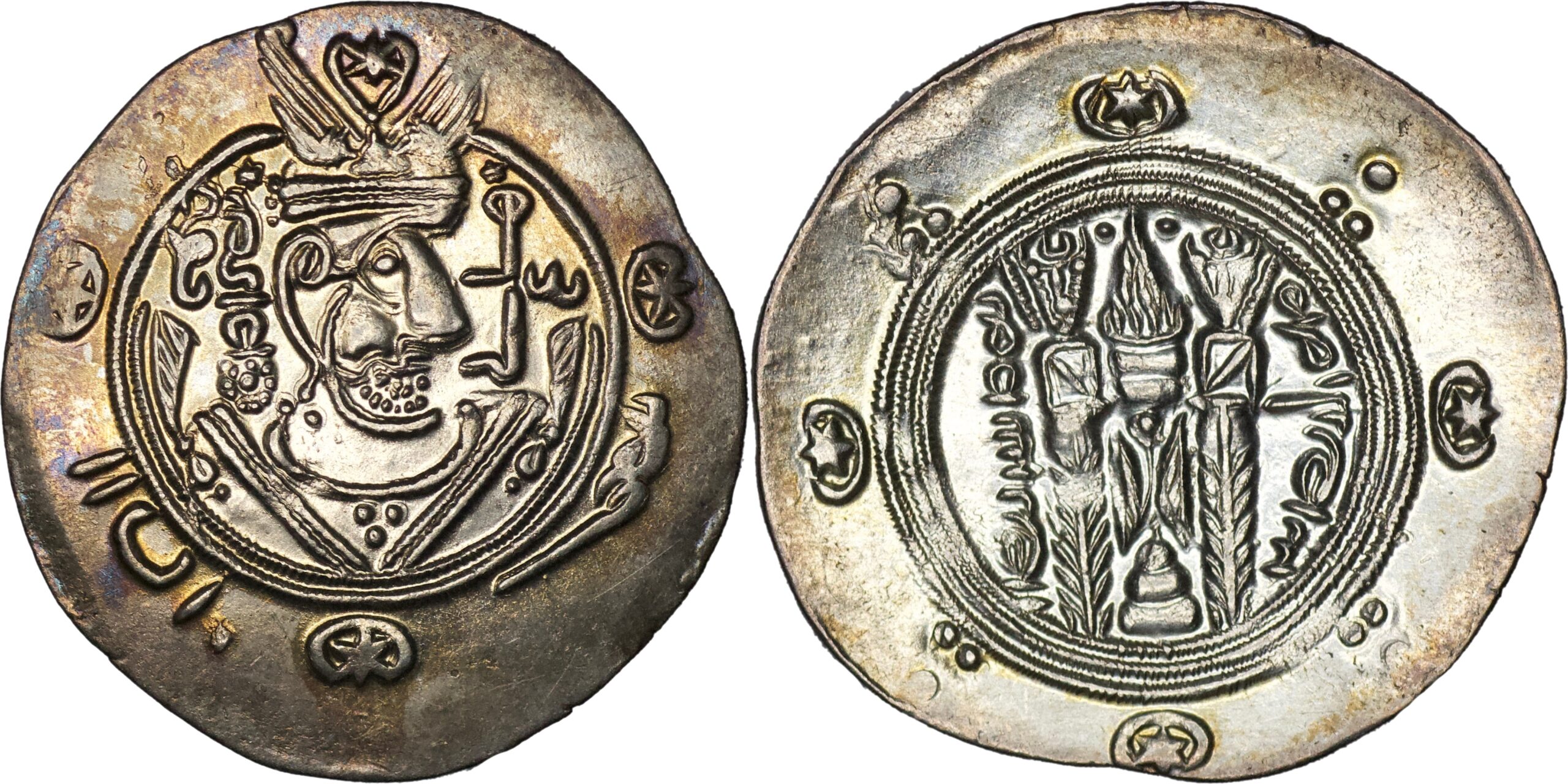 Abbasid: Temp. Al-Rashid, (AH 170-193 / AD 786-809). Dirham (1.72g/ 22mm), citing the governor of Tabaristan, Hani (AH 172-174 = AD 788-790), Tabaristan, PYE 137 = AH 172 = AD 788. Crowned and draped Sasanian-style bust to right; behind head, AFZUT GDH (‘may his kingship increase’ in Pahlawi); before head, ‘Hani’ in Kufic; in outer margin, APD / NWKW (‘excellent’ and ‘good’ in Pahlawi). Rev. Sasanian fire altar set on three steps, flanked by two attendants standing facing; to left, date; to right, mint TPURSTAN (‘Tabaristan’ in Pahlawi). Album 69. SICA I, 437. Walker, Arab-Sassanian, 291. Extremely fine, nice toning. From The Zabel collection (Pat Zabel).