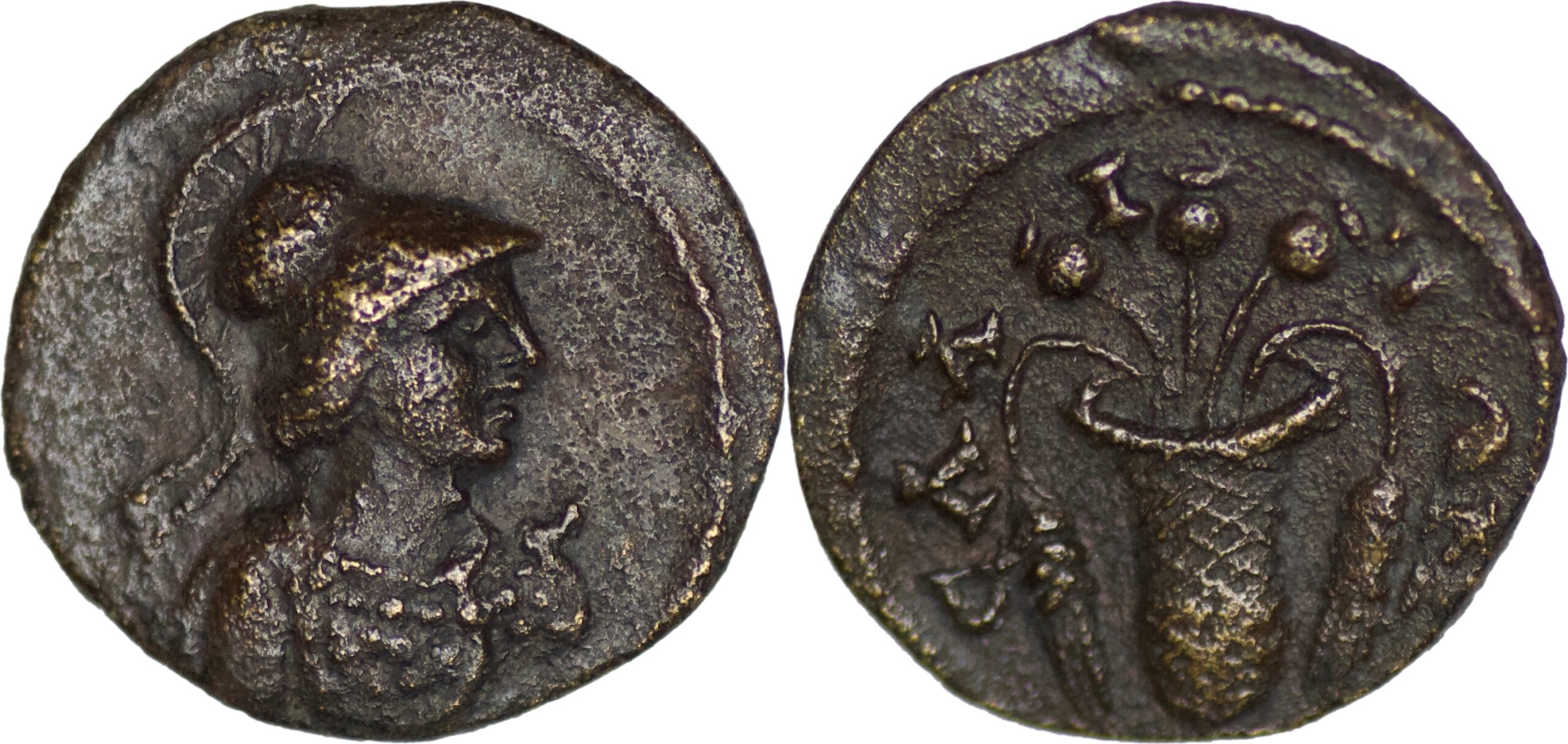 Aeolis, Elaea. Pseudo-autonomous issue, 2nd century AD. AE (1.50g/ 13mm) bust of Athena, right, wearing helmet and aegis / ΕΛΑΙΤΩΝ, Basket with poppy head among four ears of corn. RPC III 1890; BMC 34-7. Near extremely fine.