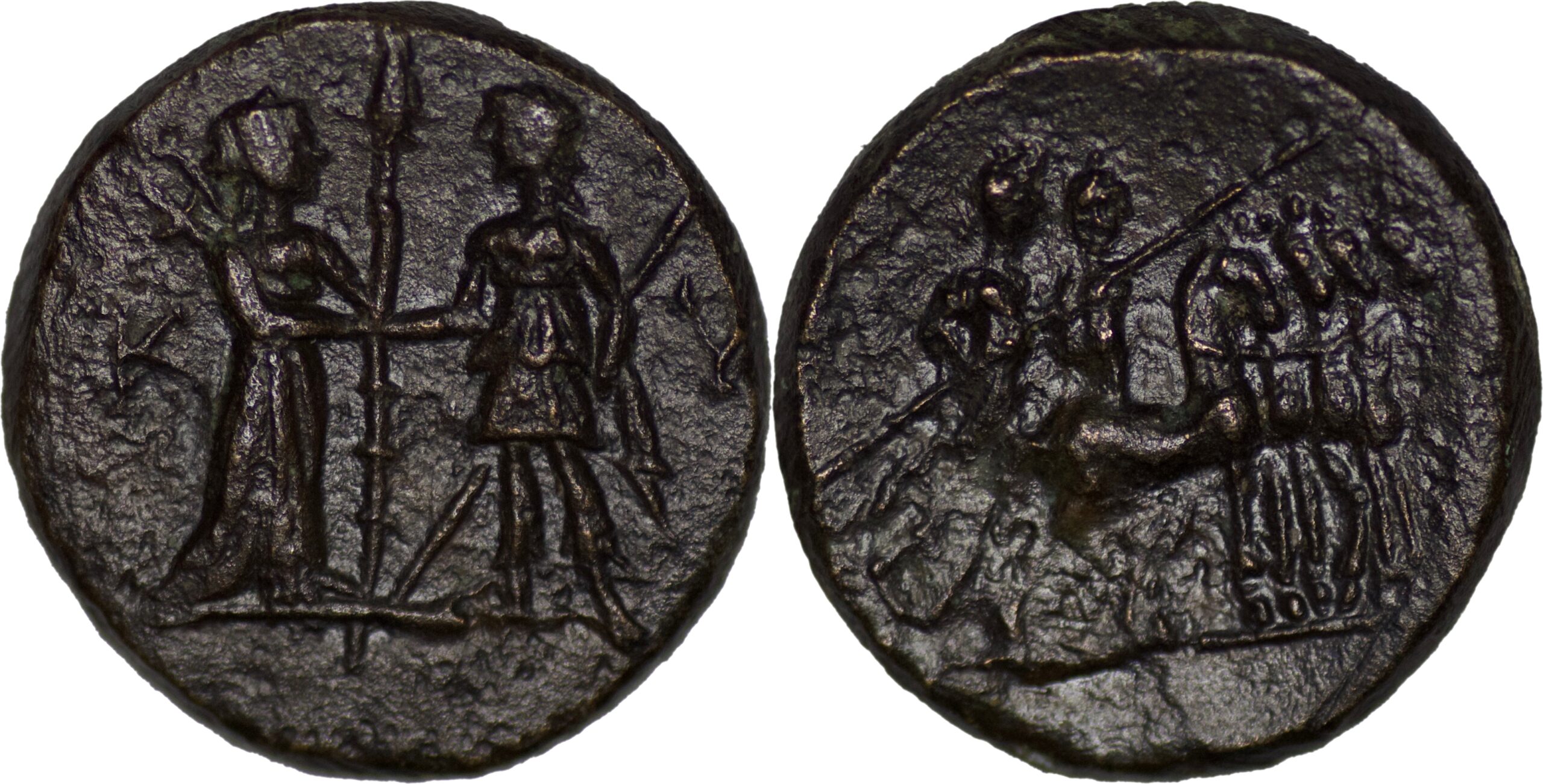 Aeolis, Kyme, 2nd century BC. Æ (3.93g/ 15mm). Artemis, holding long torch, greeting the Amazon Kyme, holding sceptre. R/ Two figures (Apollo and Kyme?) in quadriga r. SNG Copenhagen 113; SNG von Aulock 7698. Dark patina, Good VF