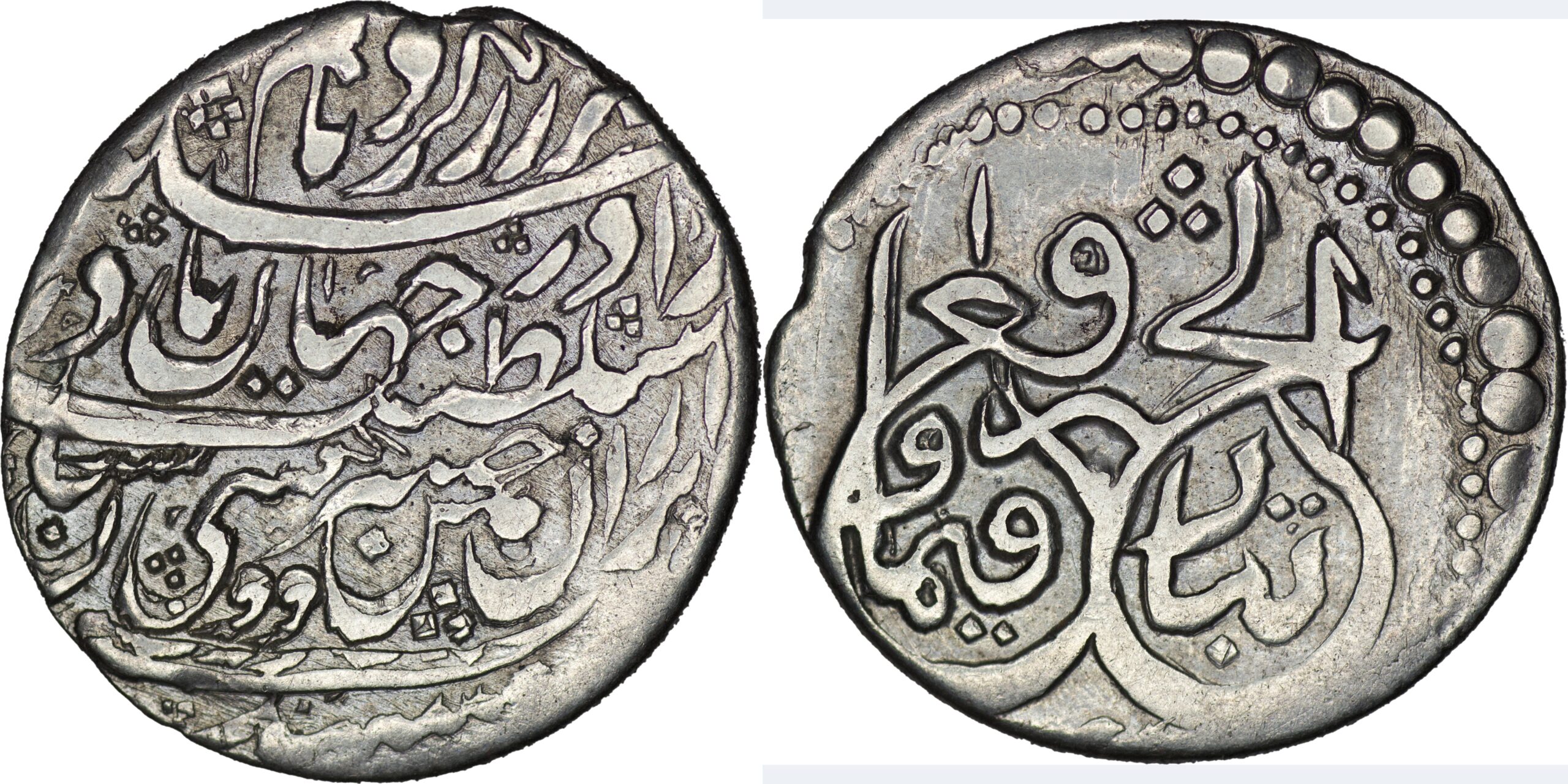AFSHARID: Nadir Shah, 1148-1160 AH/1735-1747 AD, Silver abbasi (5.33g/ 23mm), Mint of Mashhad, Date off-flan possibly AH 1150? (1737), Tughra type, Beautiful calligraphy and style, It is type A1 Album- 2748.1 rated Scarce! Very fine.