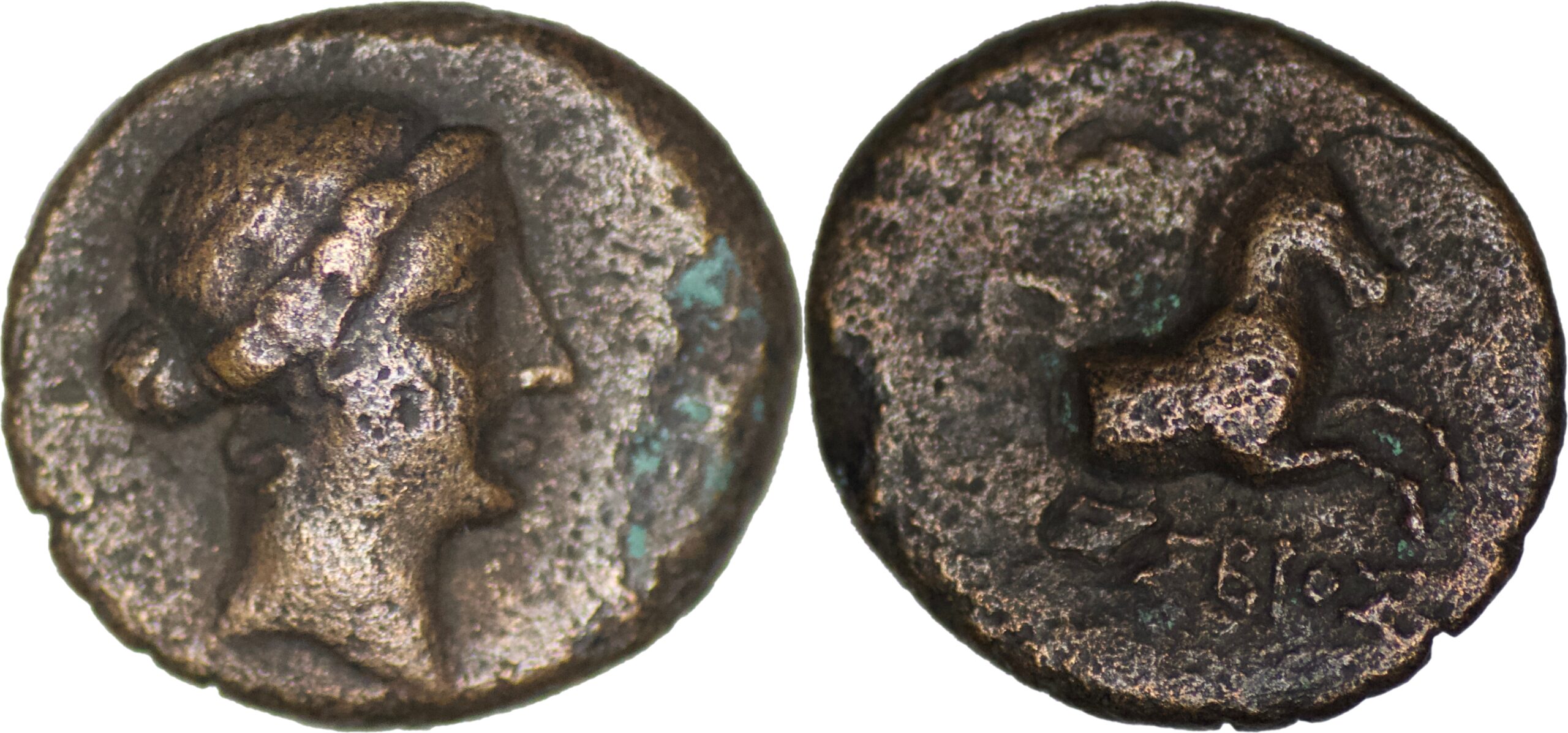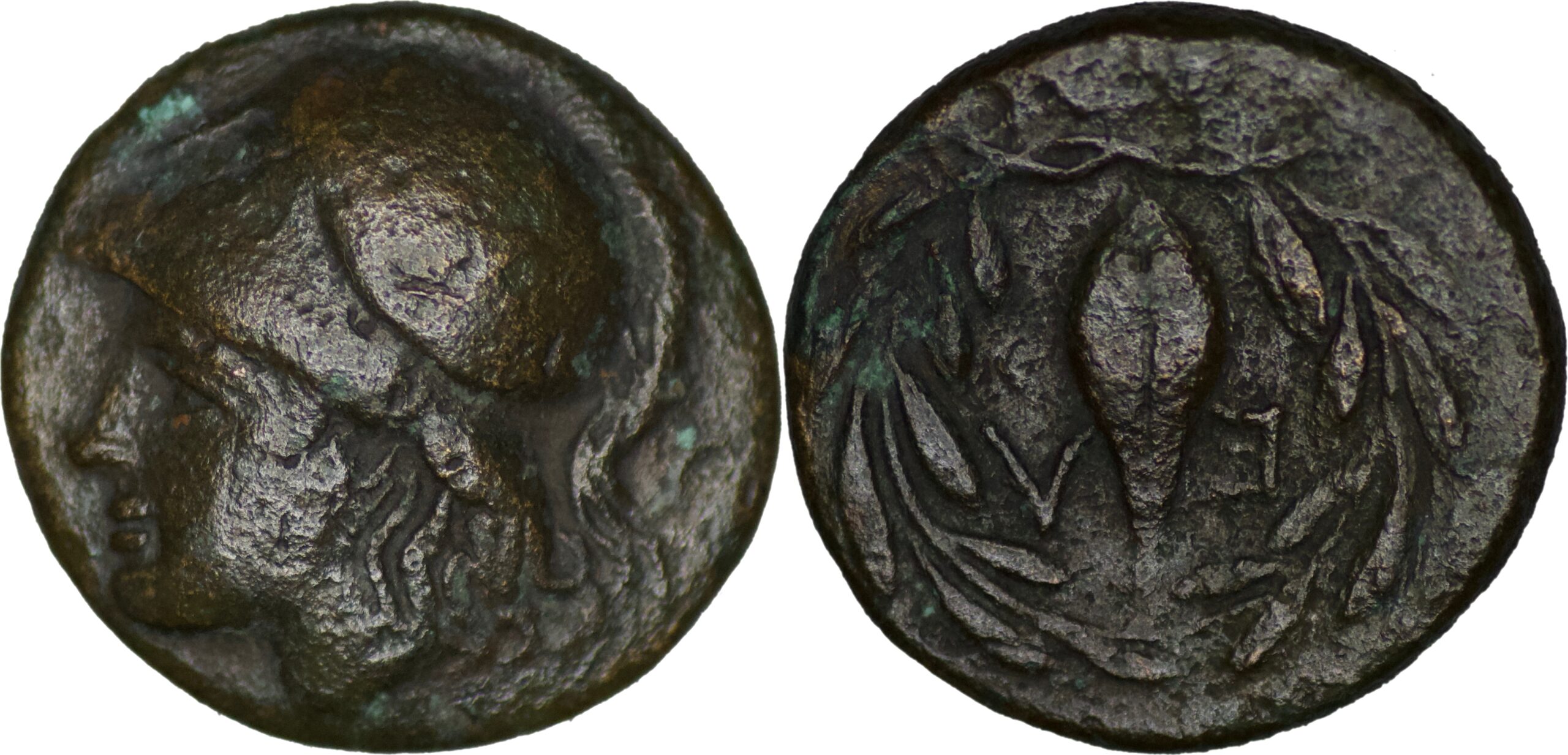 Aiolis Elaia Æ (3.65g/ 15mm) circa 340 BC. head of Athena left in Corinthian helmet/ grain-seed within olive- wreath. SNG Cop 169-170. Very fine.