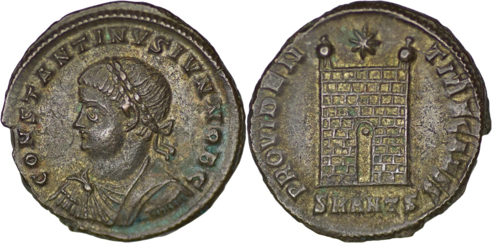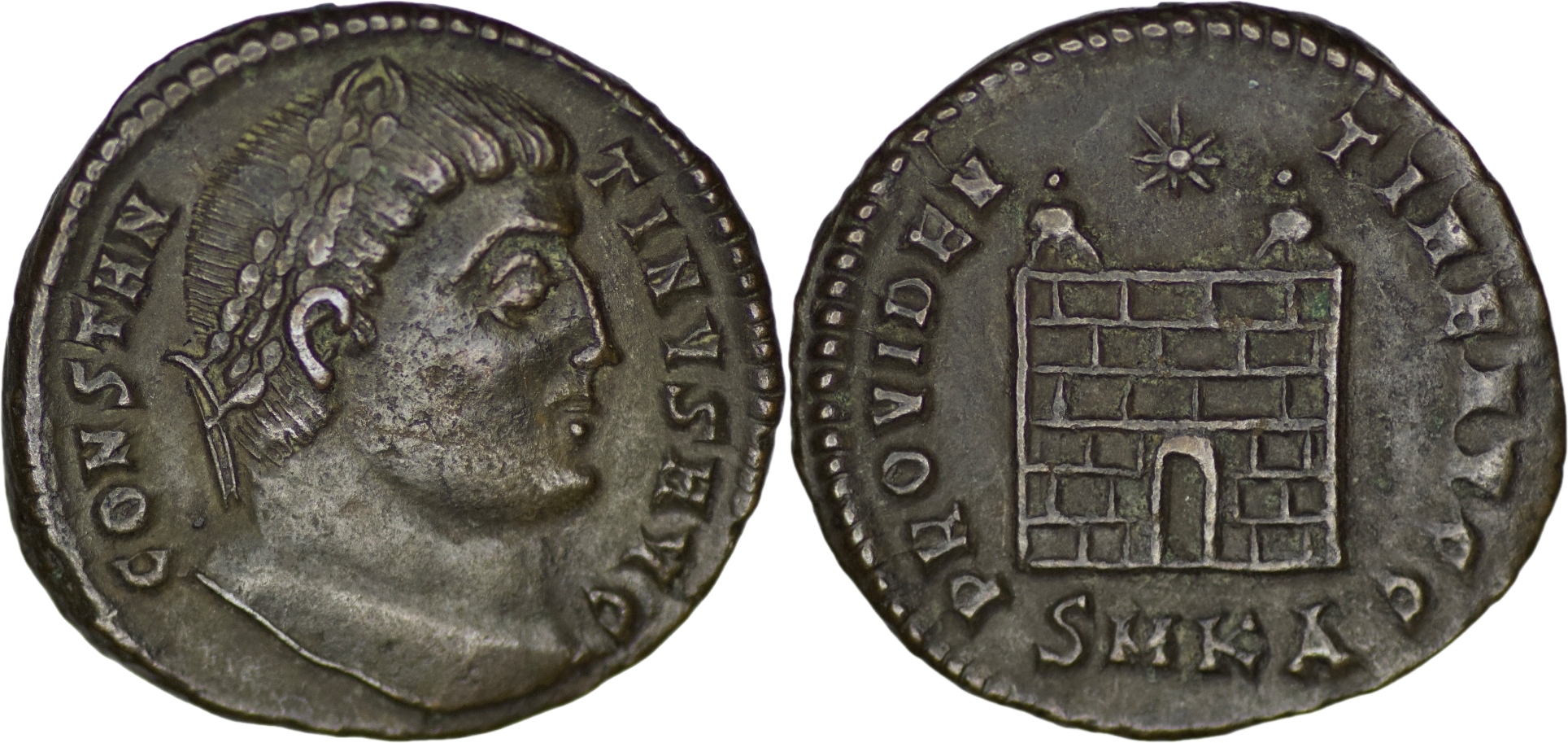 Constantine I (307/310-337). Æ Follis (2.84g/ 17mm). Cyzicus mint. 324-5. Laureate head right / Camp-gate with two turrets, star above; SMK?. RIC VII 24. Very fine.