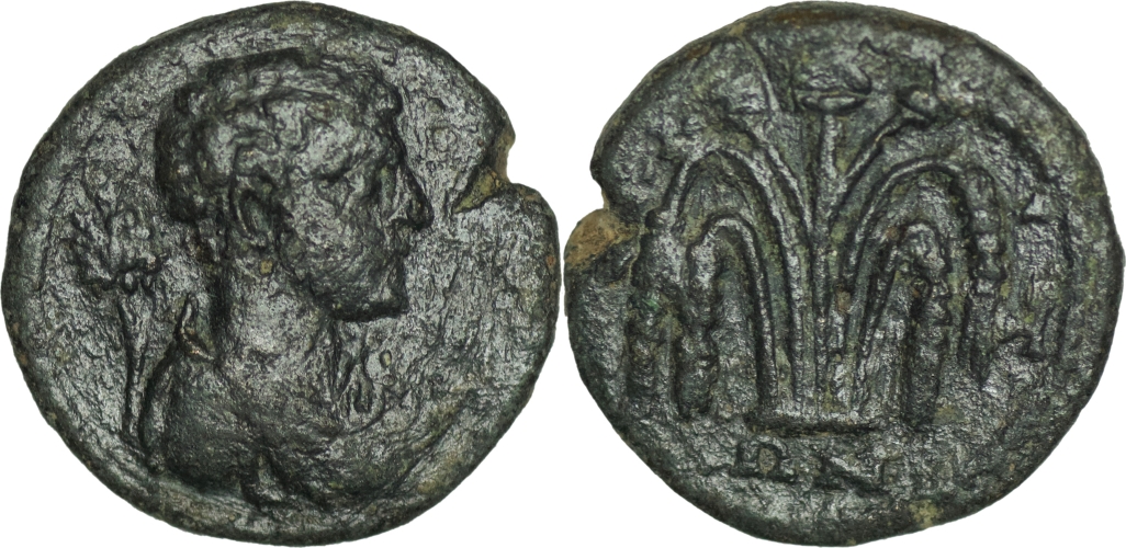 Elaea, Aeolis. AE17 (3.41g/ 15mm). semi-autonomous issue, AD 161-192. Bare-headed, draped, youthful male bust right, laurel branch behind head / EΛ-AI across fields, TΩN below, Bunch of four corn-ears and three poppies. BMC 33; BMC CGR8071.