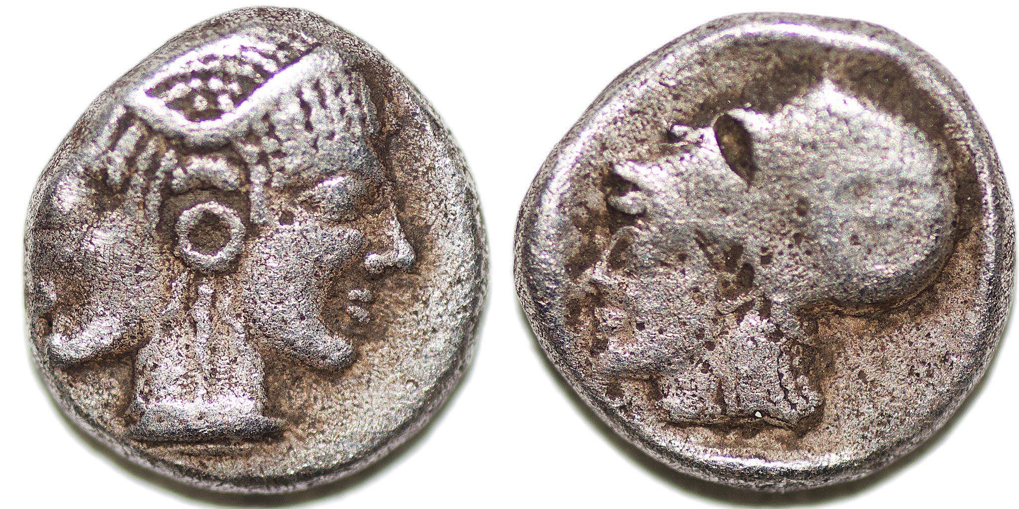 Reverse: Helmeted head of Athena to left, counter mark on the helmet; two intersecting lines whiten a circle.