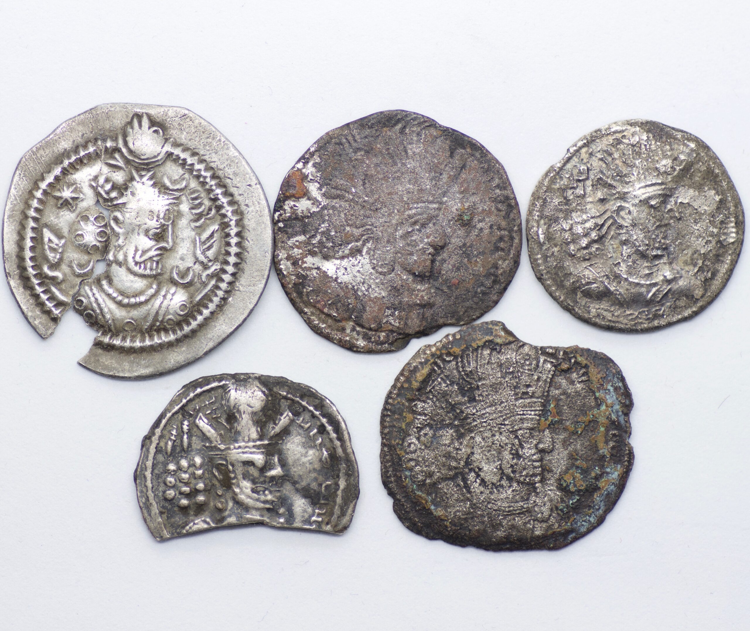 Group lot of 5 Sasanian coins. one Kavadh I drachm, two Shapur I light drachms (Very rare), two Shapur II drachms. All fien to very fine.