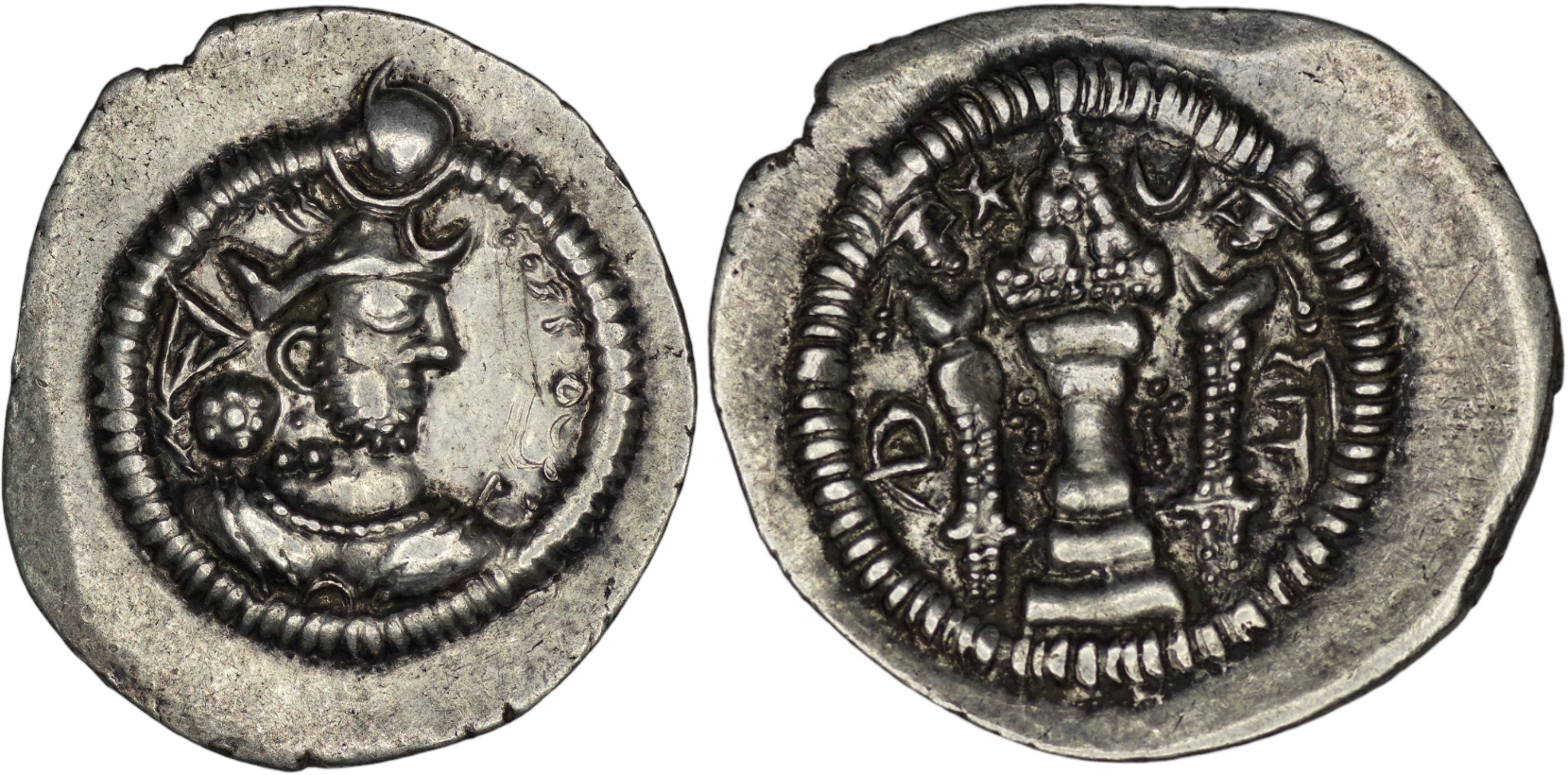 Hephtalite. Anonymous (ca. 486-490). AR Drachm (4.30g/ 26mm). Derived from Göbl-176 of Peroz, with normal winged crown of Peroz, blundered obverse legend, blundered legend left and imitative DA mint signature (for Darabjird) to right on reverse, Pahlavi “M” to left. Extremely fine.