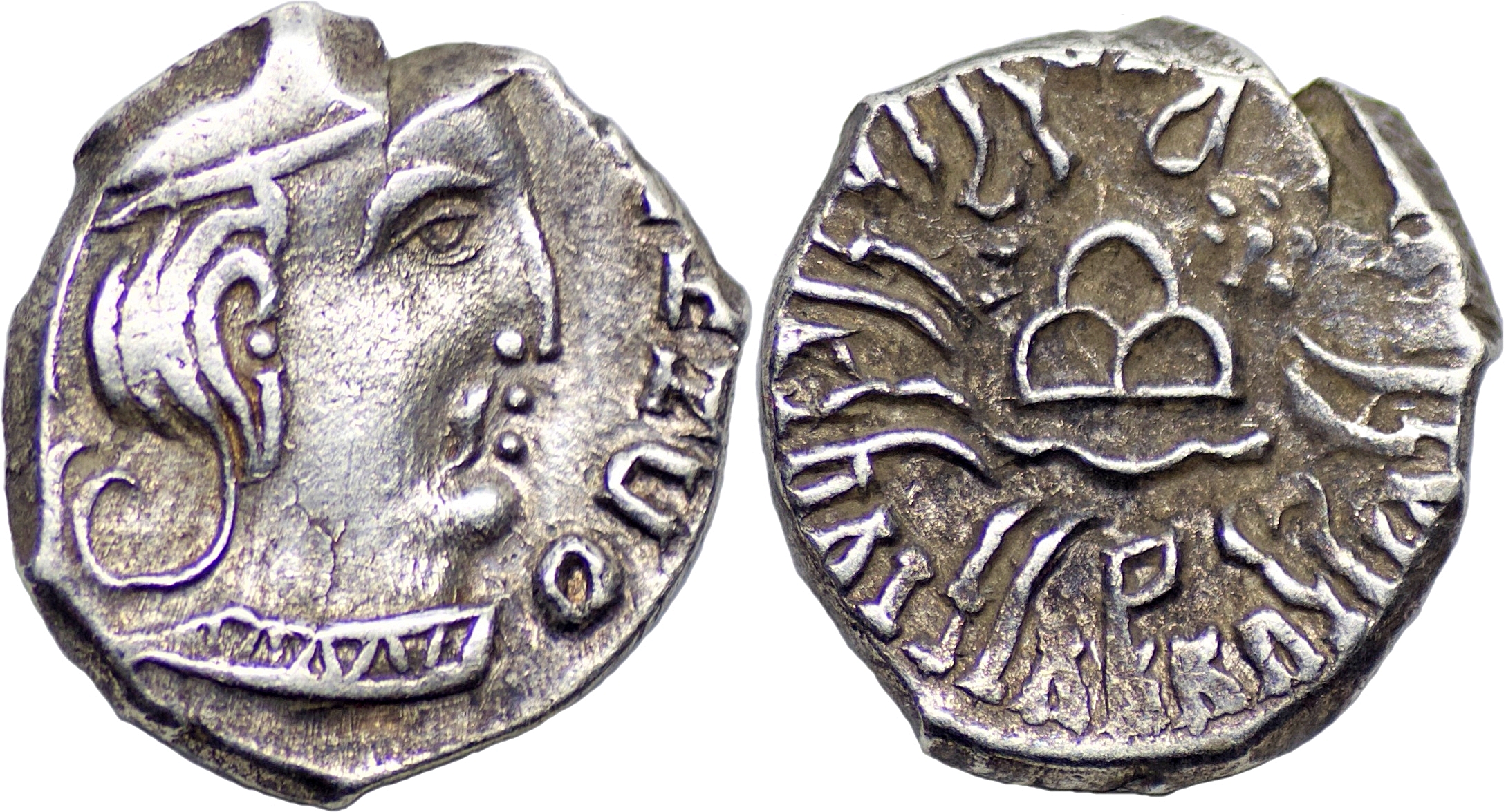 INDIA, WESTERN KSHATRAPAS: Rudrasena III (348-378 CE) Silver drachm (2.13g/ 14mm), year S. 291. Sharp strike and extremely fine.