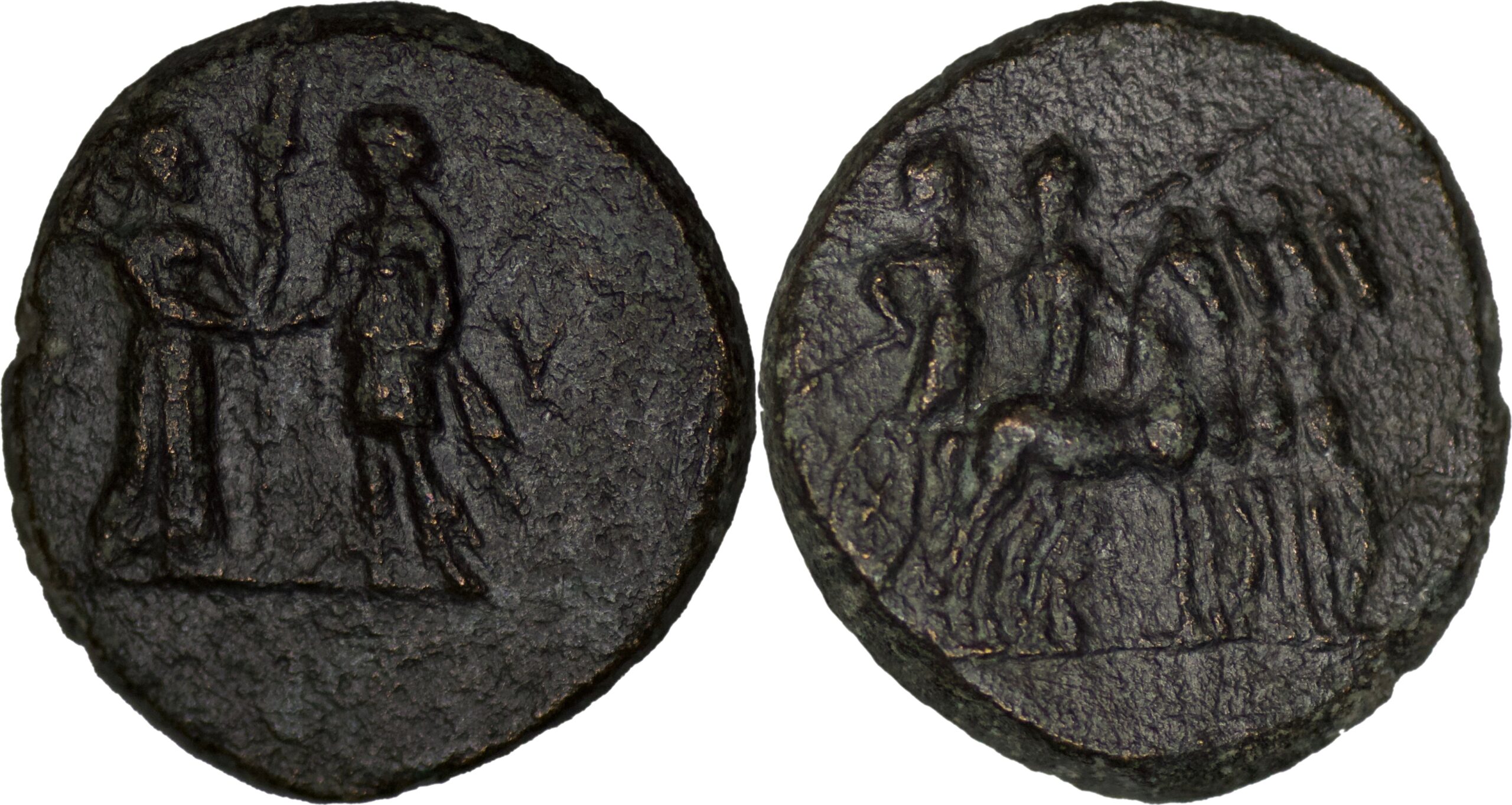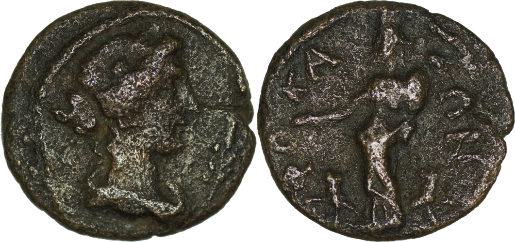 IONIA. Phocaea. Pseudo-autonomous. (1st-2nd centuries). AE (2.63g/ 16mm). Draped bust of Apollo right/ ΦΩKAEΩN, Cybele standing left, holding patera and tympanum; lion to left and right. SNG Copenhagen 1046; SNG von Aulock 2136; Lindgren III 383. Very fine.