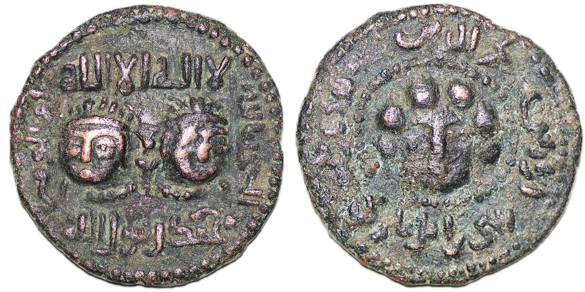Islamic, Anatolia and al-Jazira (Post-Seljuk), Artuqids, Najm al-Din Alpi (AH 547-572 / AD 1152-1176), AE Dirhem(10.97g, 29mm). Two diademed male heads facing slightly away from one another; Kalima above and below, name of Abbasid Caliph al-Mustanjid to right and left / Female head facing; name and titles of Alpi around. S&S Type 30.1; Album 1827.5. VF