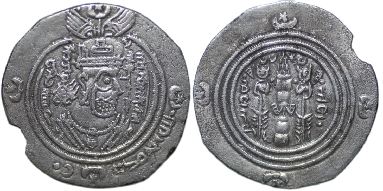 ARAB-SASANIAN: ‘Umar b. ‘Ubayd Allah, 686-691, AR drachm (2.99g), ART (Ardashir Khurra), AH70, A-21, some corrosion, but carefully conserved, VF, R.