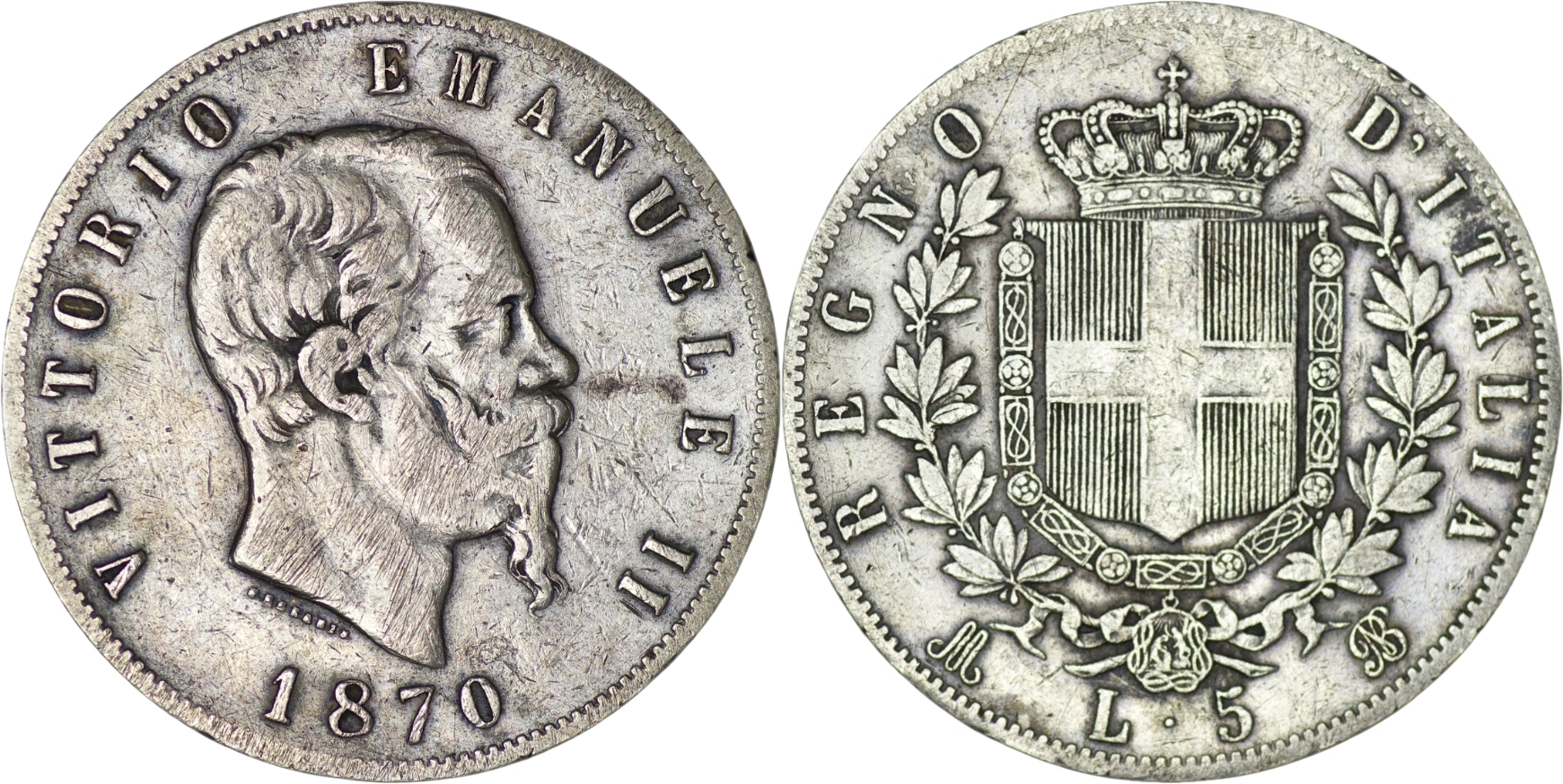 Italy. Vittorio Emanuele II (1861-1878). Silver 5 Lire. 1870. KM 8. Very fine. 25g .900 silver.
