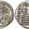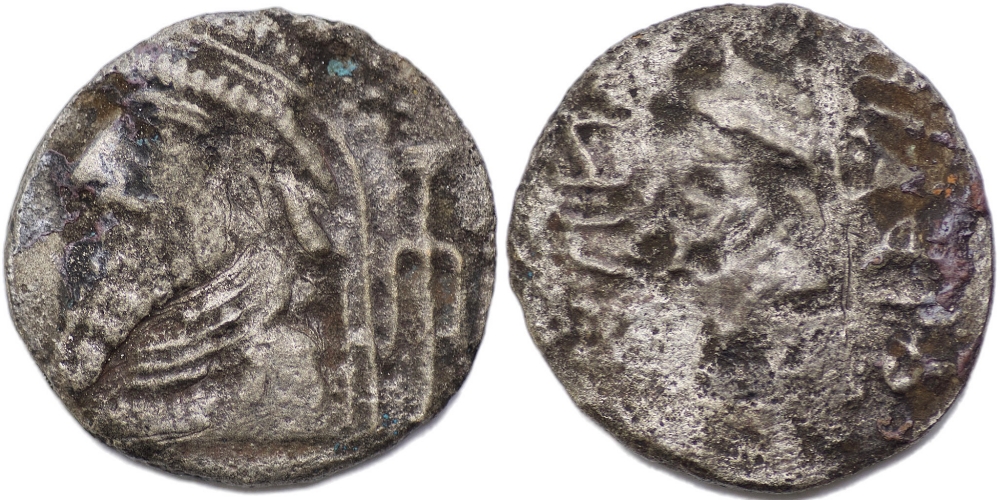 KINGS OF ELYMAIS. Kamnaskires V, circa 54/3-33/2 BC. Tetradrachm (26 mm, 9.18 g), Seleukeia on the Hedyphon. Diademed and draped bust of Kamnaskires V to left, wearing long beard and torque; to right, star above anchor symbol. Rev. BACIΛEΩC KAMNACKIPOY TOY EΓ BACIΛEΩC KAΠNACKIPOY (or similar) Diademed and draped bust of Kamnaskires V to left. Cf. van’t Haaff Type 9.1.1-4 (for type). F