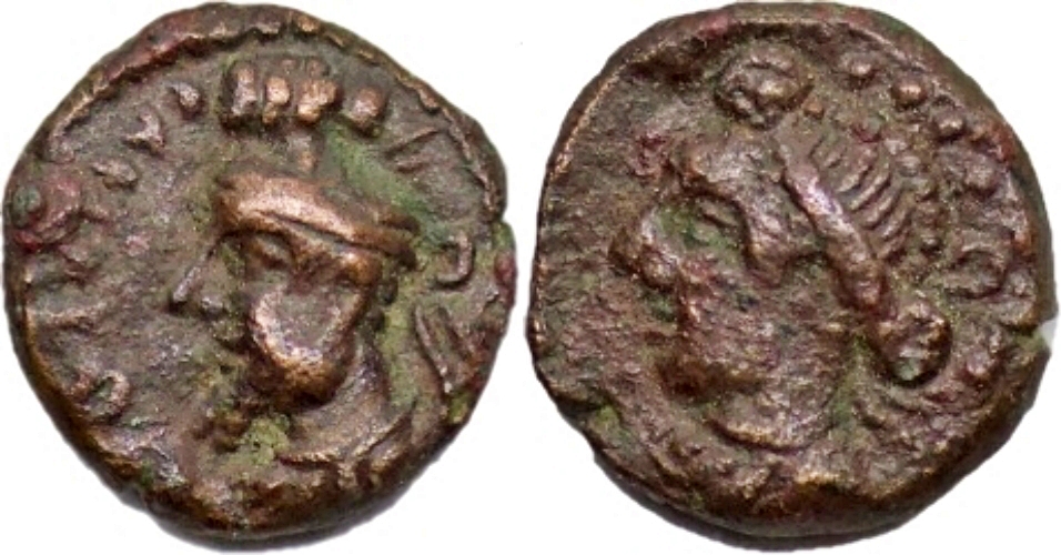 Kings of Elymais. Orodes V (c. 200-250 AD). Æ Drachm (2.85g/ 14mm). Diademed bust l. R/ Bust of Artemis l., wearing low tiara; anchor behind. Van’t Haaff Type 18.1. VF