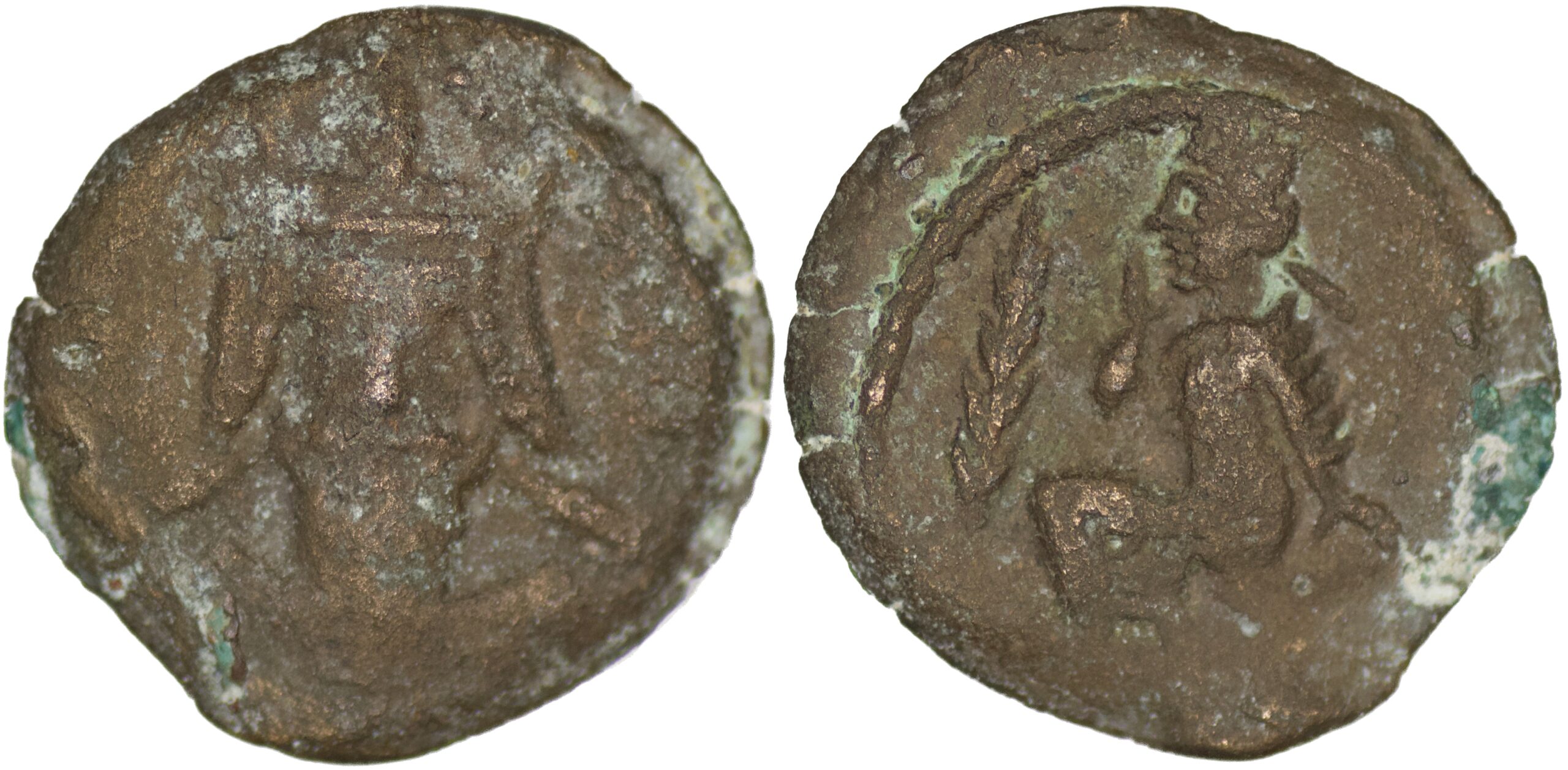 KINGS OF PARTHIA. Pakoros II (Circa AD 78-105). AE Dichalkon (3.43g/ 14mm), Seleukeia on the Tigris. Dated SE 394 (AD 82/3).Diademed and draped bust left; ΔPT (date) before./ Turreted bust of Tyche right; A to right. Sellwood 75.8. Very fine