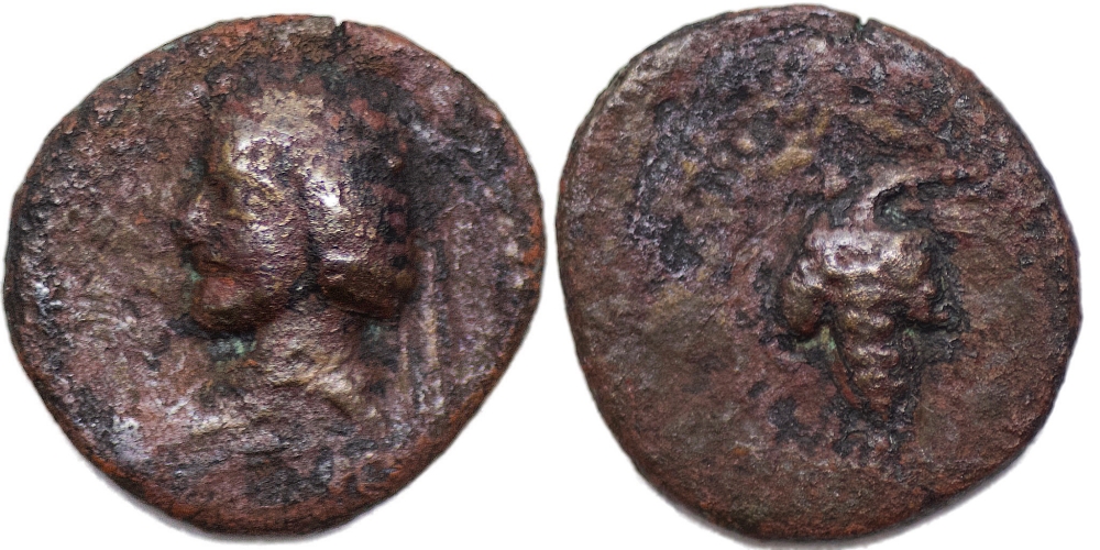 KINGS of PARTHIA. Phraates III. 70-58/7 BC. AE Chalkon (1.24 gm; 15 mm).King’s bust to the left/ bunch of grapes. Lovely strike on a nice full flan. Well centered. Nice find earthen patina. Choice EF. Very Rare