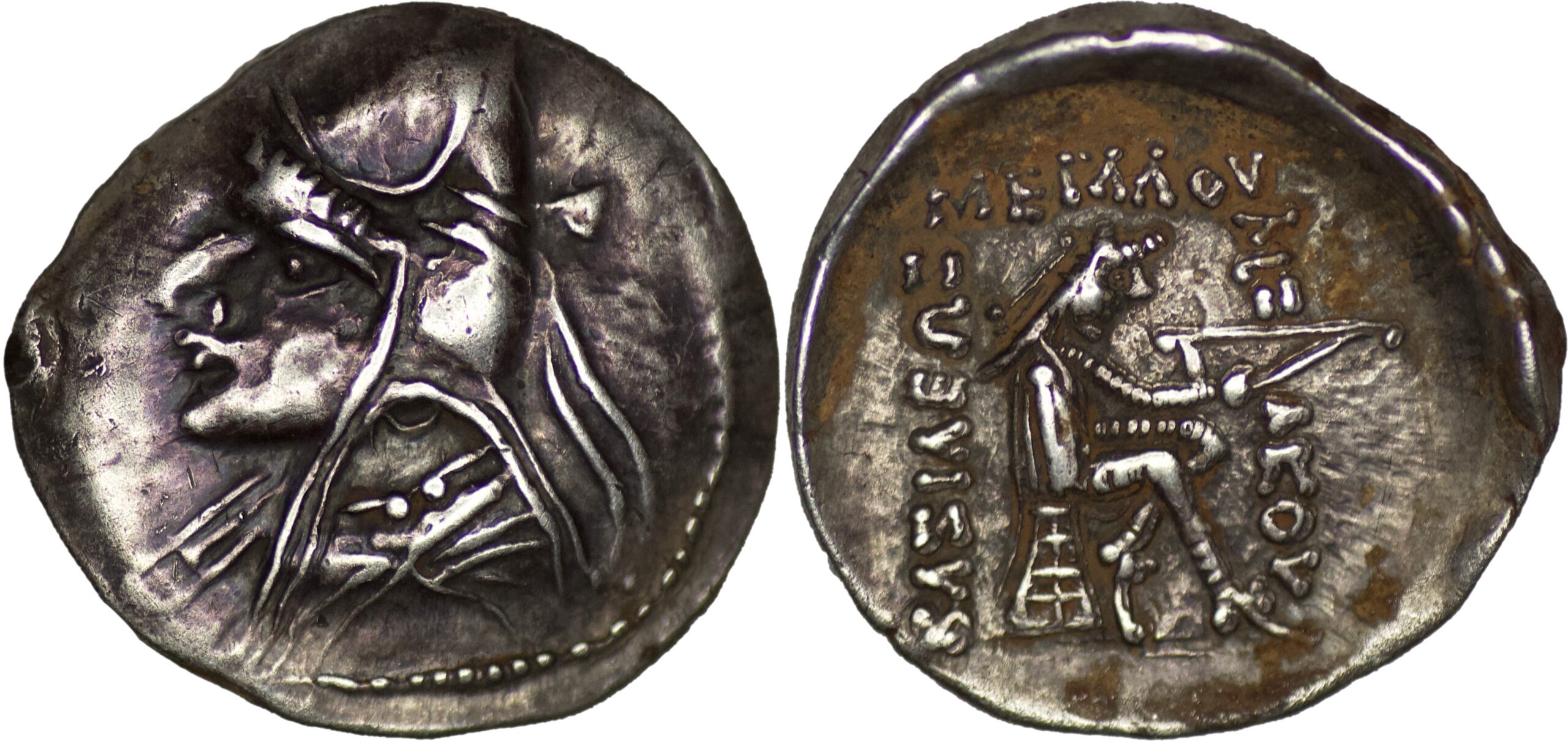 Parthian Empire. Phriapatios to Mithradates I (Circa 171-138 BC). AR Drachm (4.03g/ 19mm). Hekatompylos mint. Bust left, wearing bashlyk / Archer (Arsakes I) seated right on omphalos, holding bow. Sellwood 10.1 (Mithradates I); Shore 12-13 (Mithradates I); Sunrise 254. Lovely strike on a nice full flan. Very fine. Rare Bust.