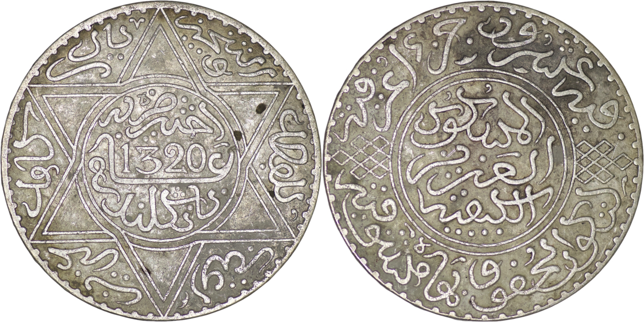 Morocco. Abdelaziz (1894-1908). AR 10 Dirhams. (24.74g/ 37mm). 1320 (1903). Y# 22.1. Very fine. Silver .900.