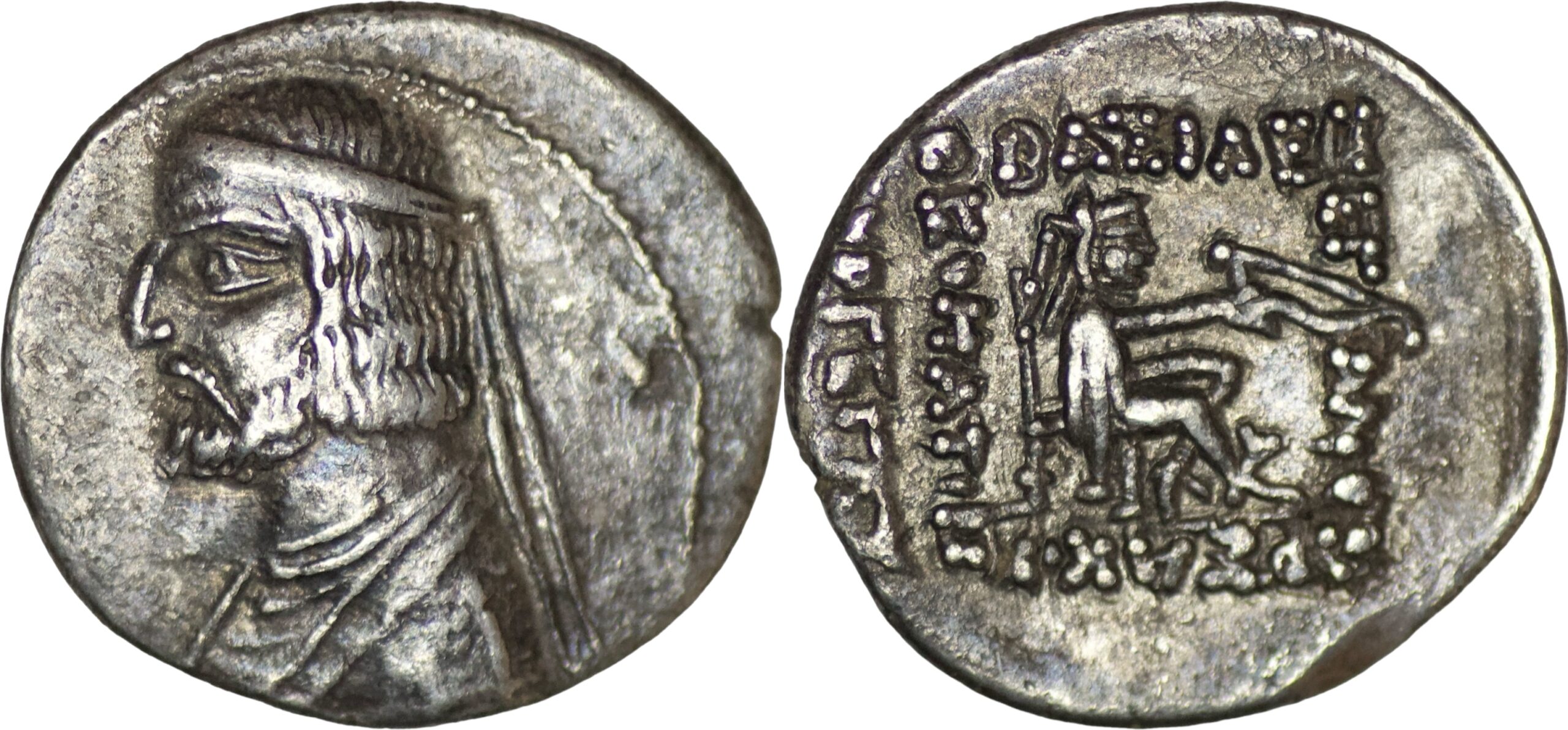 Rev: beardless archer wearing bashlyk and cloak seated right on throne with footstool, holding bow only with both hands; in field left, Greek letter Ε; no border; square four-line Greek inscription = ΒΑΣΙΛΕΩΣ ΜΕΓΑΛΟΥ ΑΡΣΑΚΟΥ ΕΠΙΦΑΝΟΥΣ.