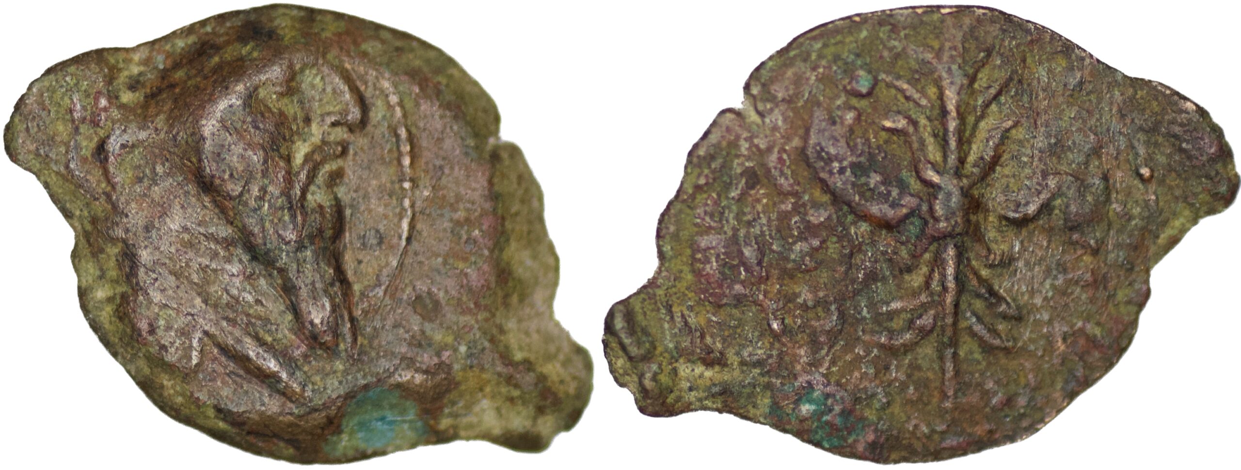 PARTHIAN EMPIRE. Mithradates II (121-99), AE Chalkon, c. 119-99 BC (1.11g/ 11mm) Diademed and bearded bust right/ Palm tree . Very RARE