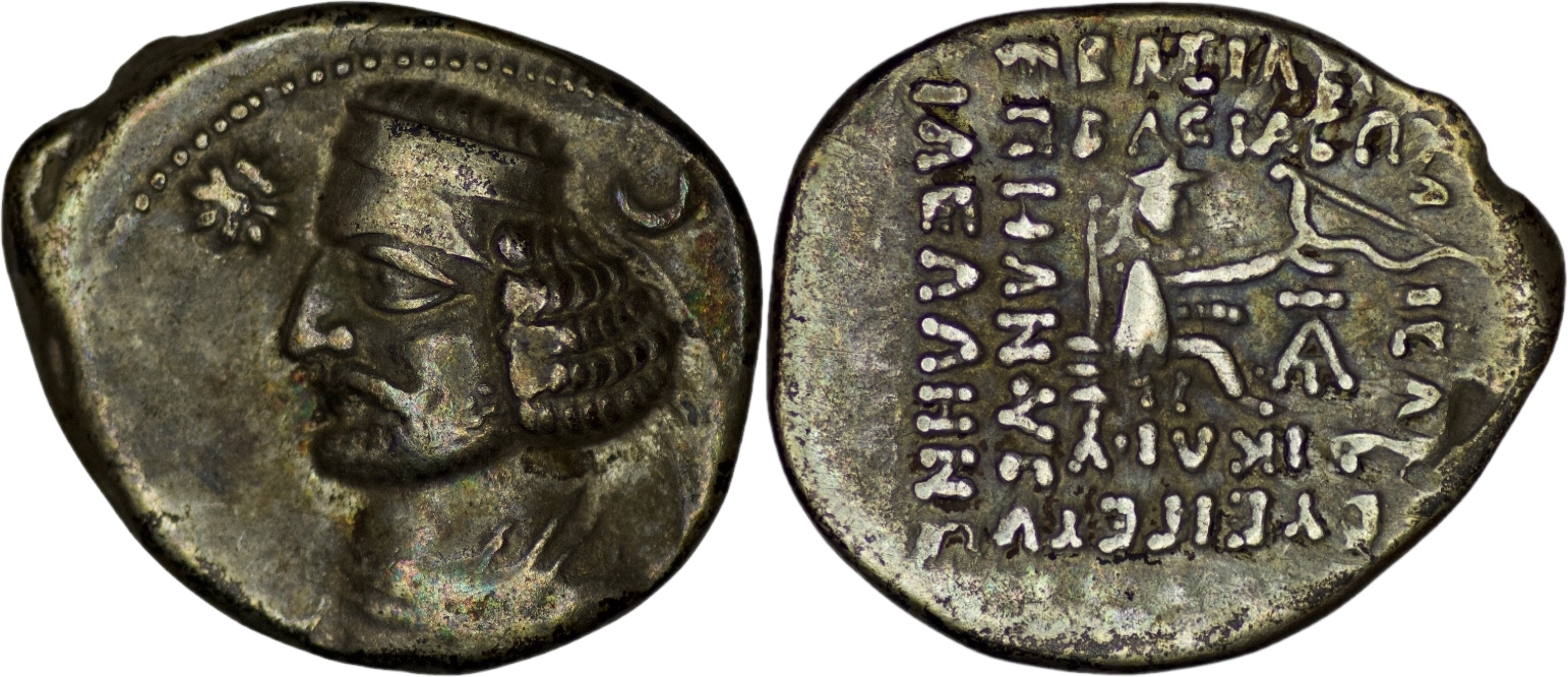 Parthian Empire. Orodes II. Circa 57-38 BC. AR Drachm (3.95/ 20mm). Ecbatana mint. Diademed bust left; star to left, crescent to right / Archer seated right, holding bow. Sellwood 47.5; Shore 239. Very fine, toned.