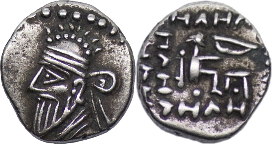 PARTHIAN EMPIRE. Pacorus II (AD78-120), AR Diobol, (1.36g), draped bust left wearing diademed tiara with “hooks” on crest, rev. square five-line blundered legend, archer seated right, holding out bow, monogram below (Shore 402; Sunrise 436; Sellwood, Num. Chron. 1989, type 8, pl. 42), toned, very fine. Ex Spink auction.