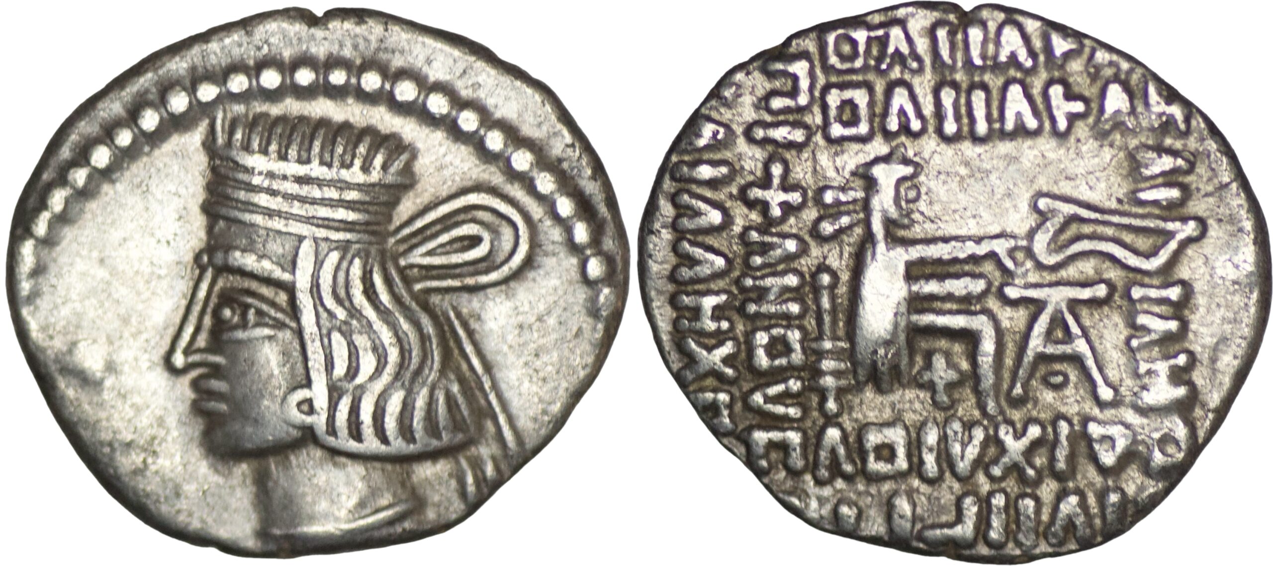 Parthian Empire. Phraatakes 2 BC.- 4/5 AD. AR Drachm (3.62g/ 18mm). Ekbatana mint. Diademed bust left, wart on forehead; Nikai flanking, crowning Phraatakes with wreathes / Archer (Arsakes I) seated right on throne, holding bow. Sellwood 57.13; Shore 322; Sunrise 402. Well centered. Extremely fine. Nice original find patina. Rare. Possibly minted during Jesus time.
