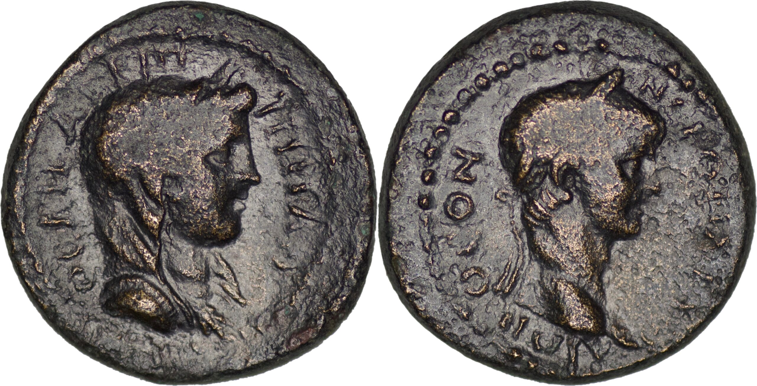 Roman Provincial. AEOLIS. Kyme. Nero, with Agrippina II (54 – 68). Æ (3.51g/ 16mm). ΘЄΟΝ ΝЄΡΩΝΑ ΚΥΜΑΙΩΝ. Laureate head of Nero right / ΘЄΑΝ ΑΓΡΙΠΠΙΝΑΝ. Draped bust of Agrippina right. RPC I 2434. BMC 130, Cop 143. Very fine.