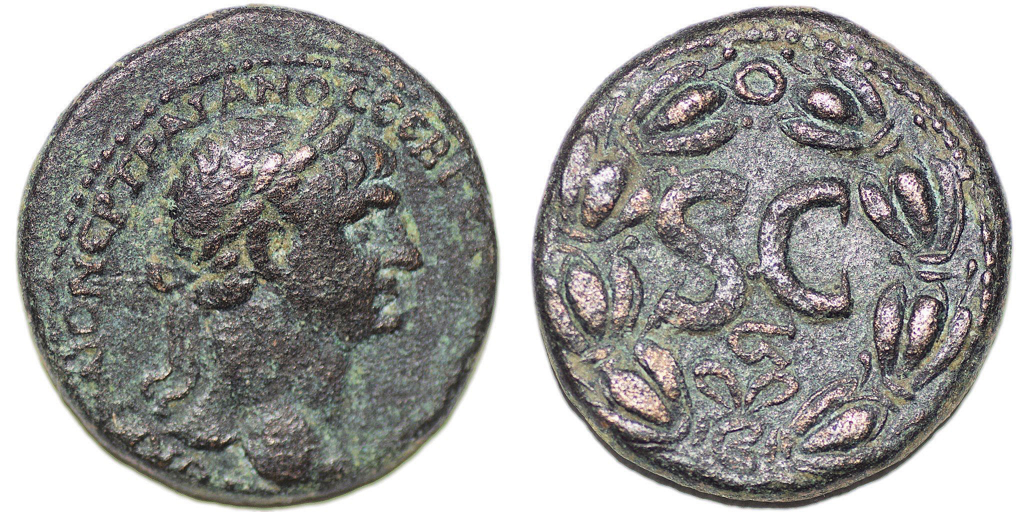 Roman Provincial “Syria, Seleucis and Pieria. Antiochia ad Orontem. Trajan. A.D. 98-117. AE (28mm, 14.85 g). [ΑΥΤΟΚ]Ρ ΚΑΙС ΝЄΡ ΤΡΑΙΑ[ΝΟС СЄΒ ΓЄΡΜ ΔΑΚ], laureate head of Trajan right / Large SC within laurel-wreath of 8 leaves, beneath, ς. BMC 283. Good VF