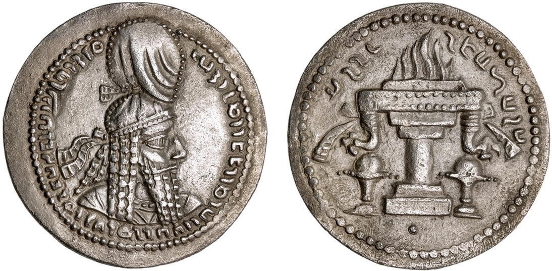 Sasanian Empire. Ardashir I (223/4-240). AR Drachm. Ctesiphon. (4.11 g). Diademed bust right wearing tight-fitting headdress with korymbos, no earflaps, rev. Fire altar, pellet below. Sunrise 713. Extremely Fin, nice toning. Ex John C. Huntington Collection.
