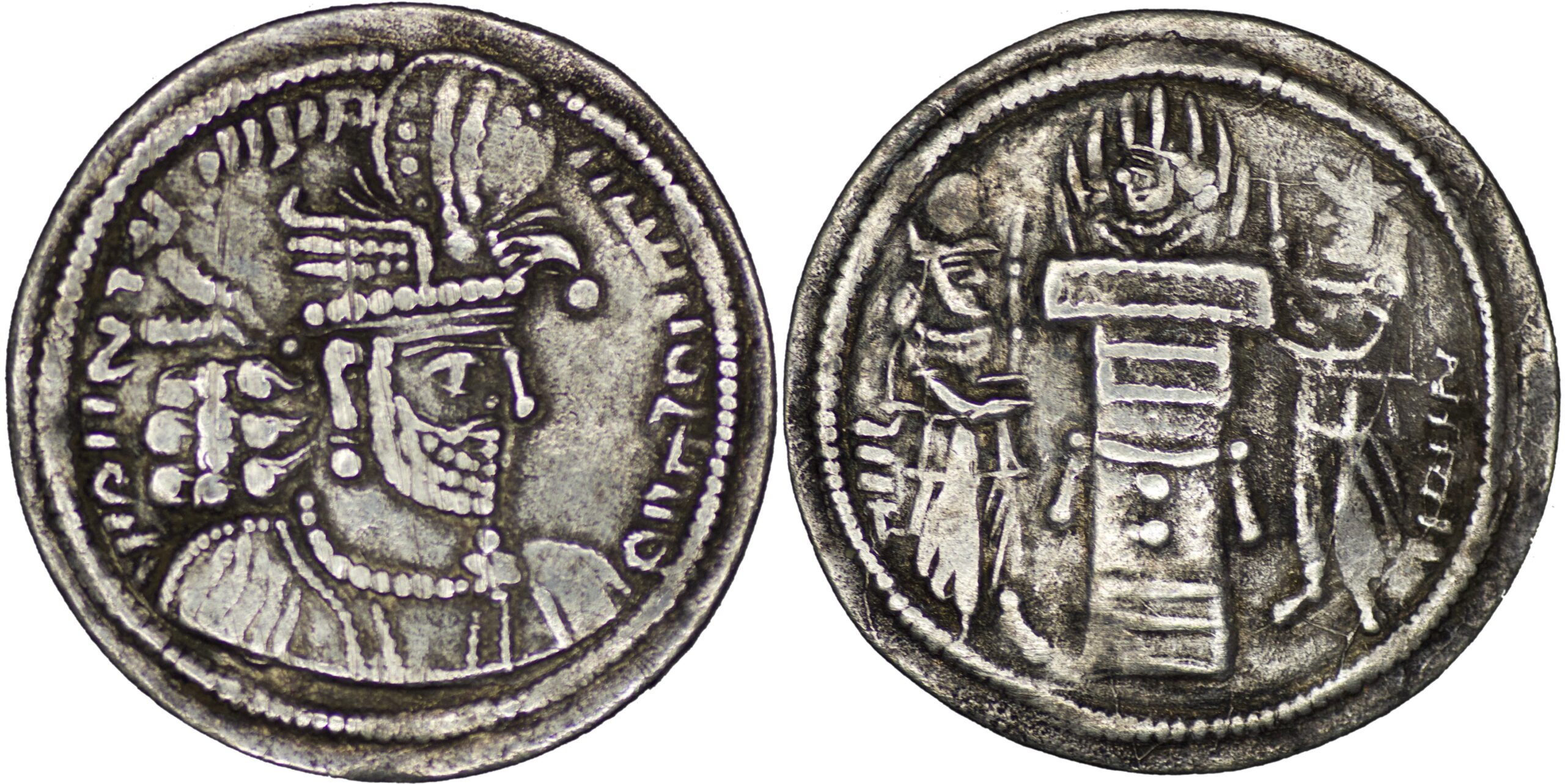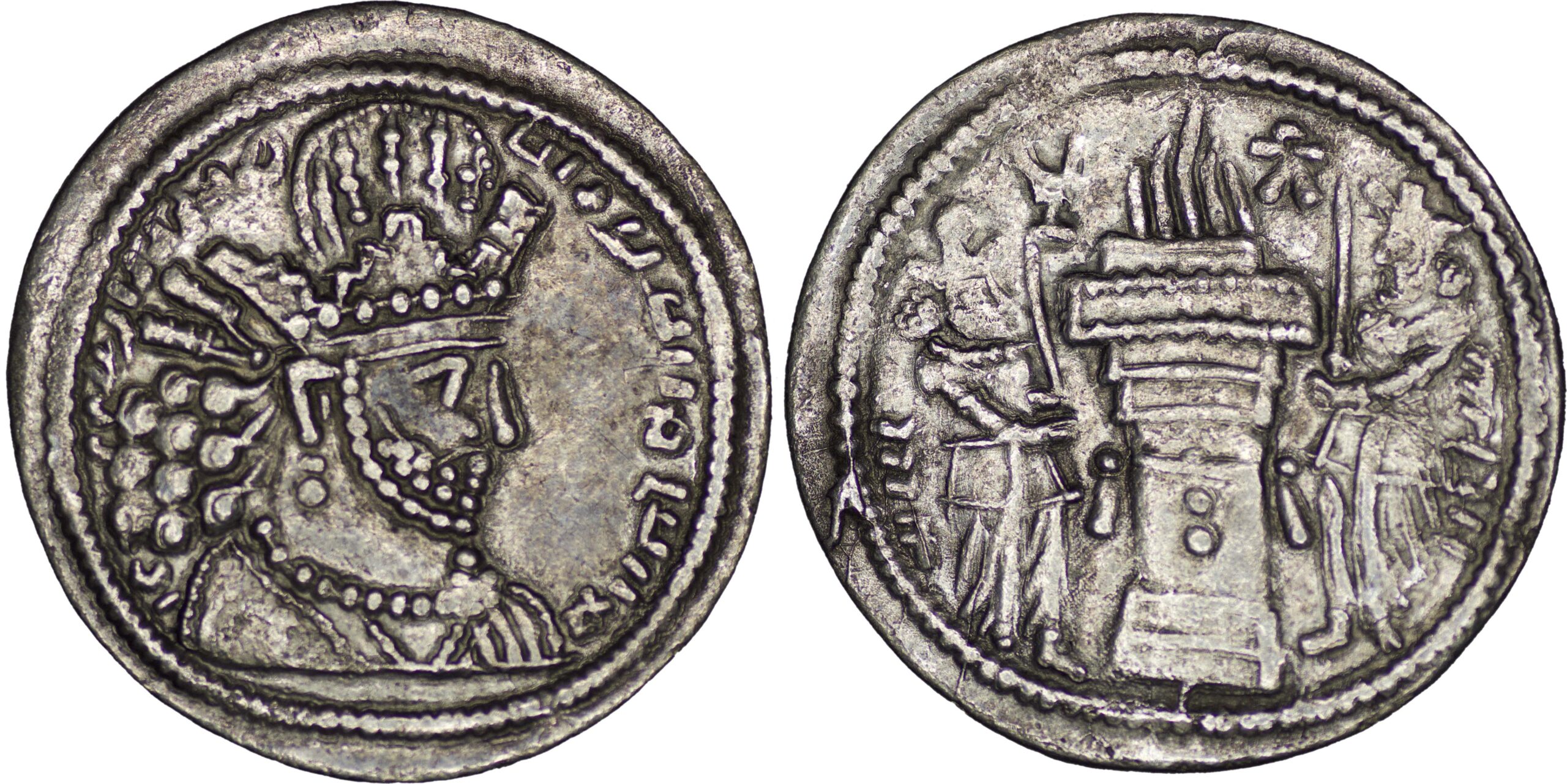 Sasanian Empire. Hormizd II (303-309). AR Drachm (3.42g/ 25mm). Draped bust of Hormizd II to right, wearing winged crown with korymbos and falcon’s head (Varagna). Rev. Fire altar with bust flanked by Hormizd, standing front on the left, head to right, crowned and holding barsom bundle in his left hand and by attendant, standing front on the right, head to left, waering mural crown and holding barsom bundle in his right hand. SNS II, pl. 52, 24. Toned, very fine.