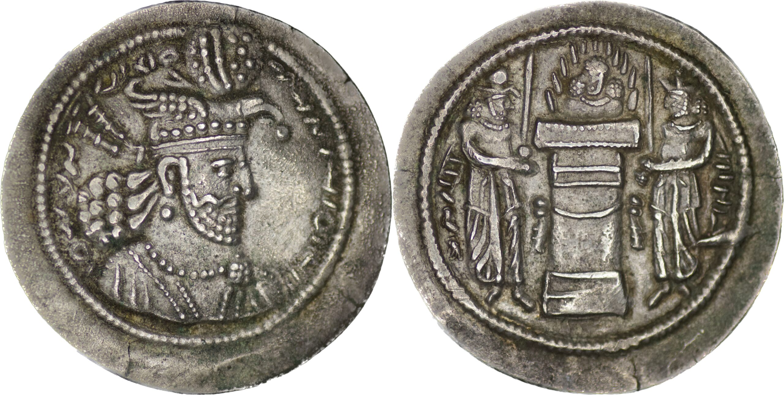 Sasanian Empire, Kavad I (Kavadh) (484-531). AR Drachm(4.01g/ 28mm) . MY (Meshan) mint, Year 33 – 2nd reign. Bust right, wearing mural crown with frontal crescent, two ribbons, and korymbos set on crescent, ribbons and crescents on shoulders; stars flanking head, star-in-crescents in margin / Fire altar with ribbons; flanked by two attendants; star and crescent flanking flames. SNS type Ic/1a; Göbl type III/1; Saeedi -; Sunrise 967. Very fine.