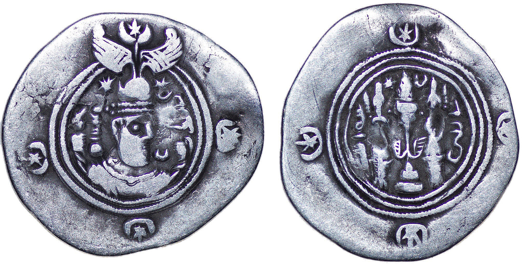 Obverse: Draped bust of Khosrau II to right, wearing elaborate mural crown; behind head, HWSRWD (‘Khosrau’ in Pahlawi)