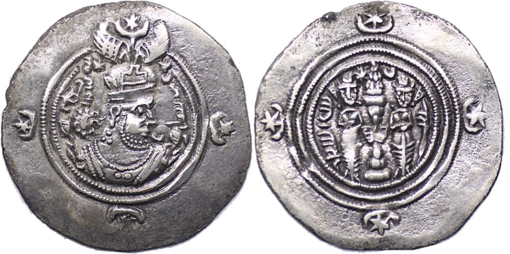 SASANIAN EMPIRE. Khusrau II (590-628). AR Drachm(3.89g/ 31mm). ShY (Shiraz) mint, year 23 (612/3). Crowned bust r. R/ Fire altar flanked by attendants. Göbl II/3. Extremely fine piece.