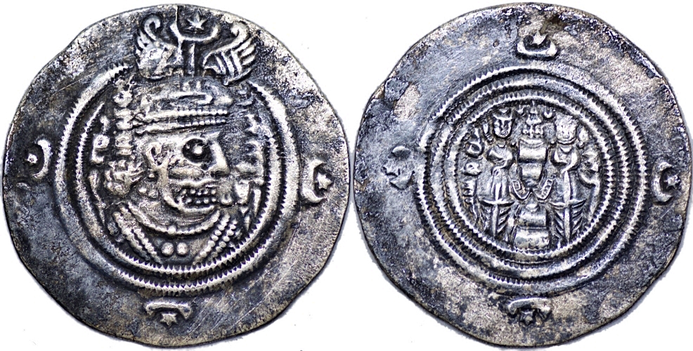 Sasanian empire. Khusrau II AD 590-628 . AR Drachm (3.32g/ 31mm), AL Mint, Date 37. Choice very fine, original patina.