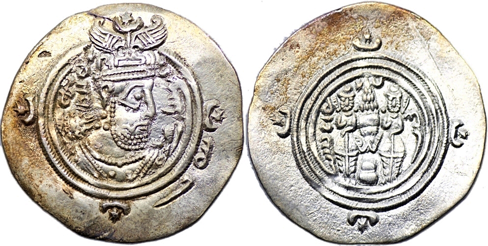 Sasanian empire. Khusrau II AD 590-628 . AR Drachm (4.09gg/ 32mm), DA (Darabgird) Mint, Date 35. Choice very fine, original patina.