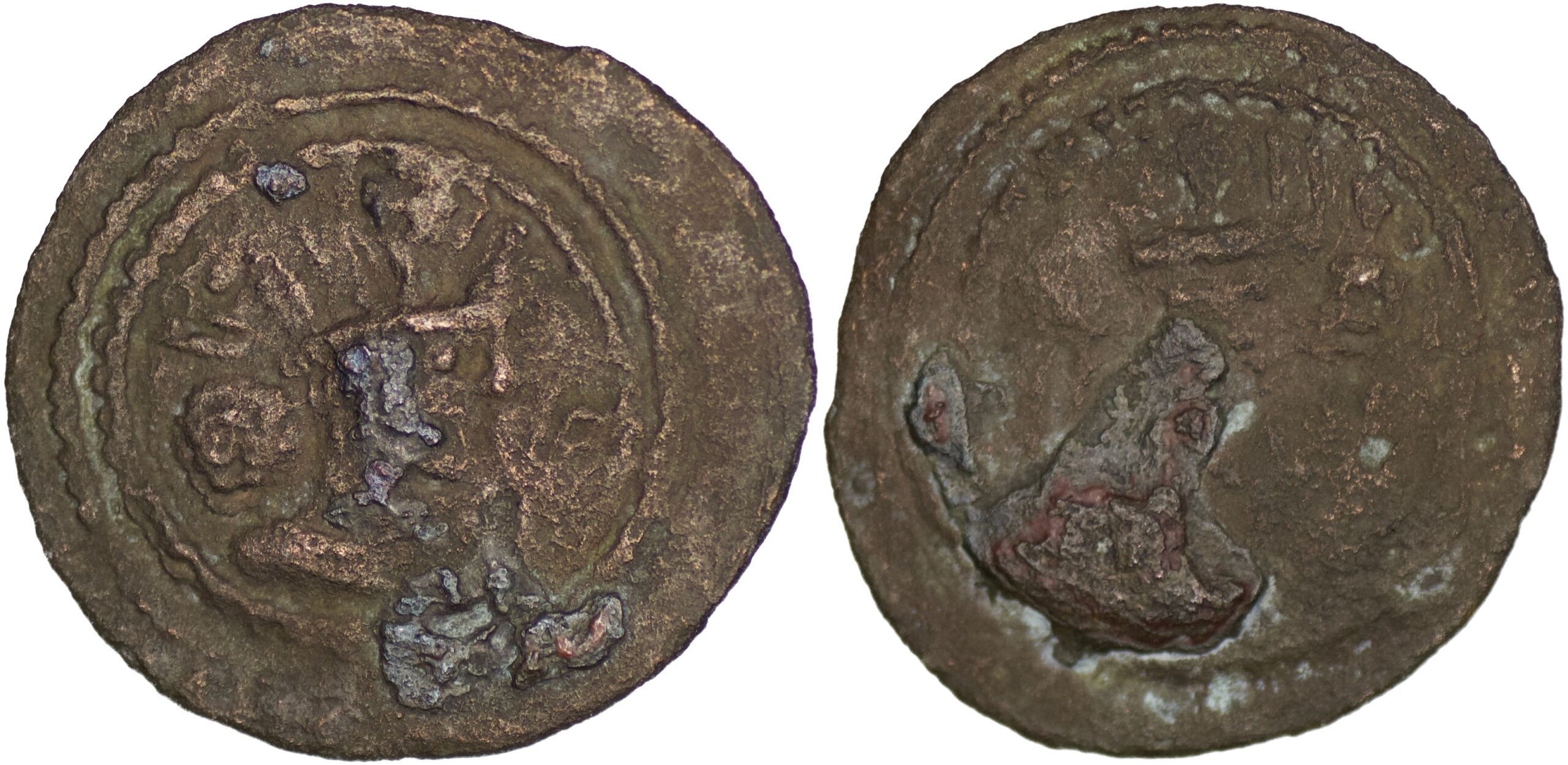 SASANIAN EMPIRE. Shahpur II (AD 309-379) AE Pashiz (2.09g/ 19mm). Bust of Shapur II right, wearing diadem and mural crown with korymbos/ Fire altar franked by two attendants, original patina on reverse. Very Fine. RARE