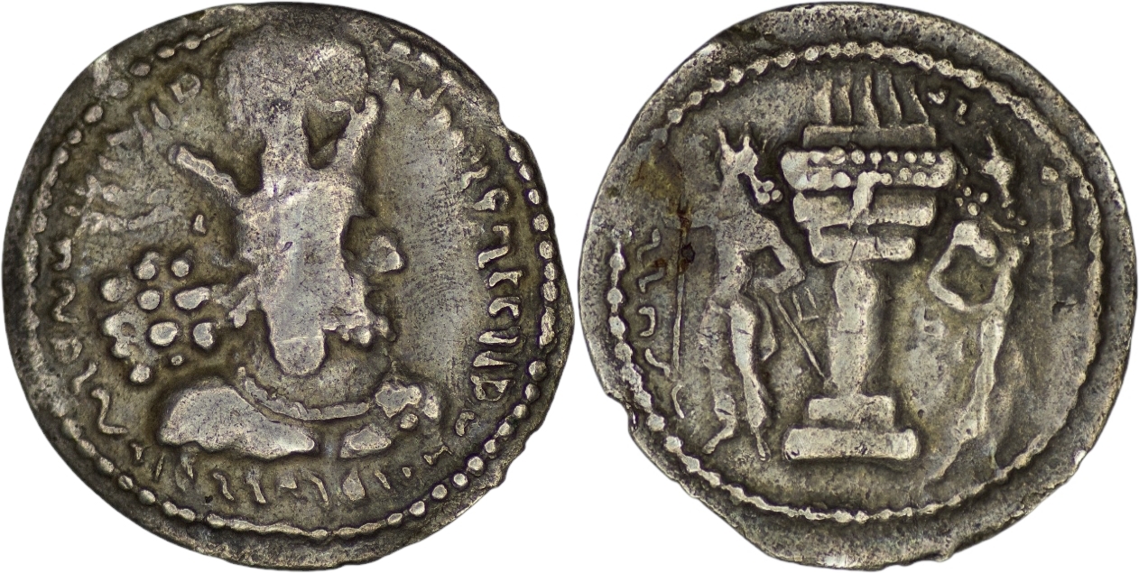 Sasanian Empire. Shapur I (A.D. 241-272). AR Obol (0.7 g/ 13mm). Mint I (“Ctesiphon”), phase 1b, ca. AD 244-252/3. Bust of Shapur I right, wearing diadem and mural crown with korymbos. Reverse: Fire altar; flanked by two attendants wearing mural crowns. NS Type Iic/1a, Style A, Group D and pl. 22, 20-5. Rare. Well centered and fully struck. Lightly toned. Very Fine, toned.