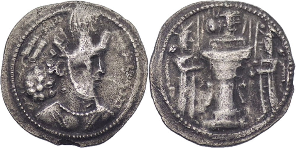 SASANIAN Empire, Shapur II, AD 309-379. AR drachm (3.70g/ 21mm). Bust of Shapur II right, wearing mural crown with korymbos / Fire altar with attendants and ribbon; bust of Ahura Mazda right, rising from altar. SNS Ib1/3a; Göbl Ia/6a. Very fine. Original patina.