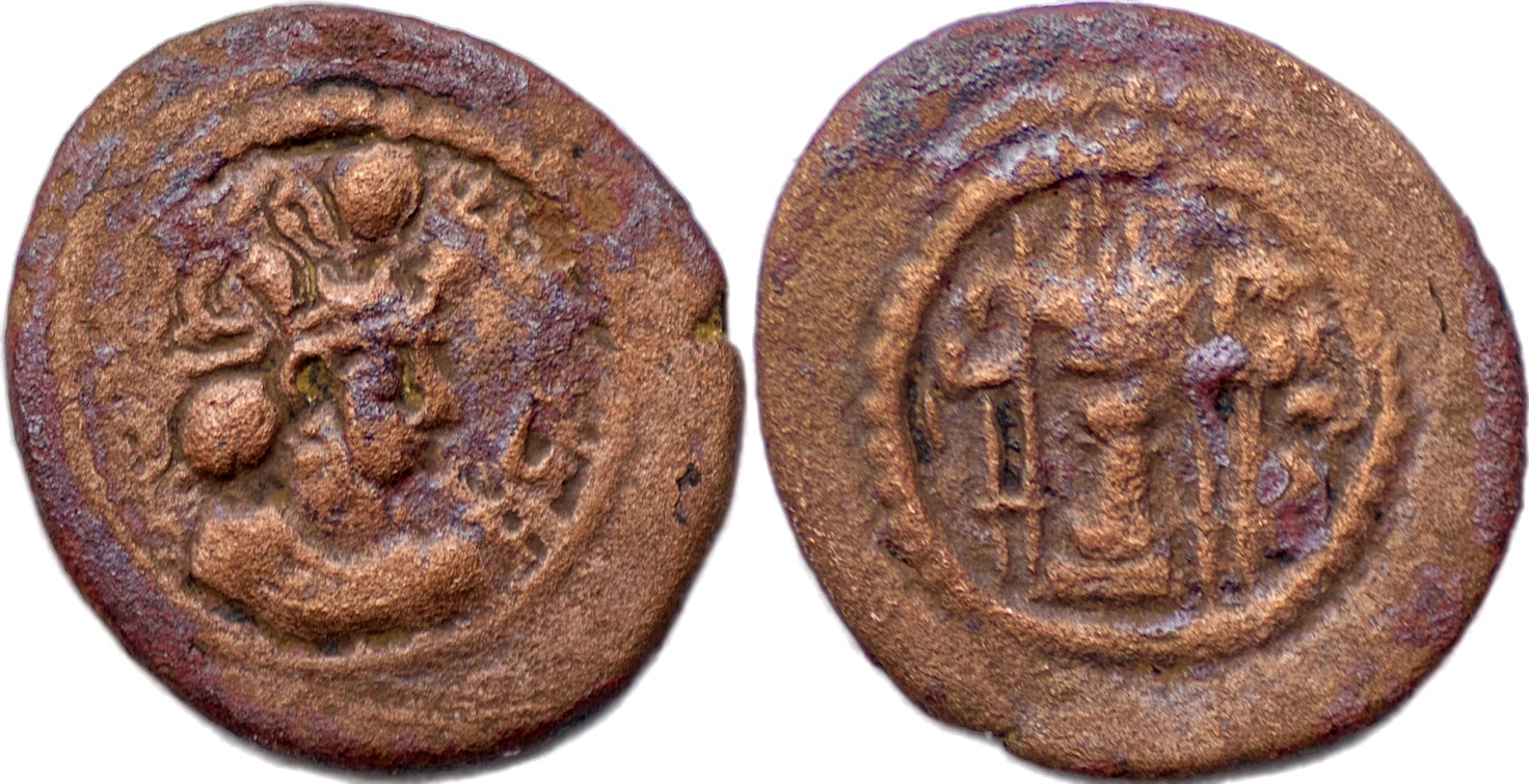SASANIAN EMPIRE, Vahram V (Varahran), AD 420-438, AE Pashiz (2.13 gm; 17mm). Vahram’s bust right, Scripts to right /fire-altar & two attendants. Gobl I/1. Well struck on a nice flan. Choice aEF. Very rare.