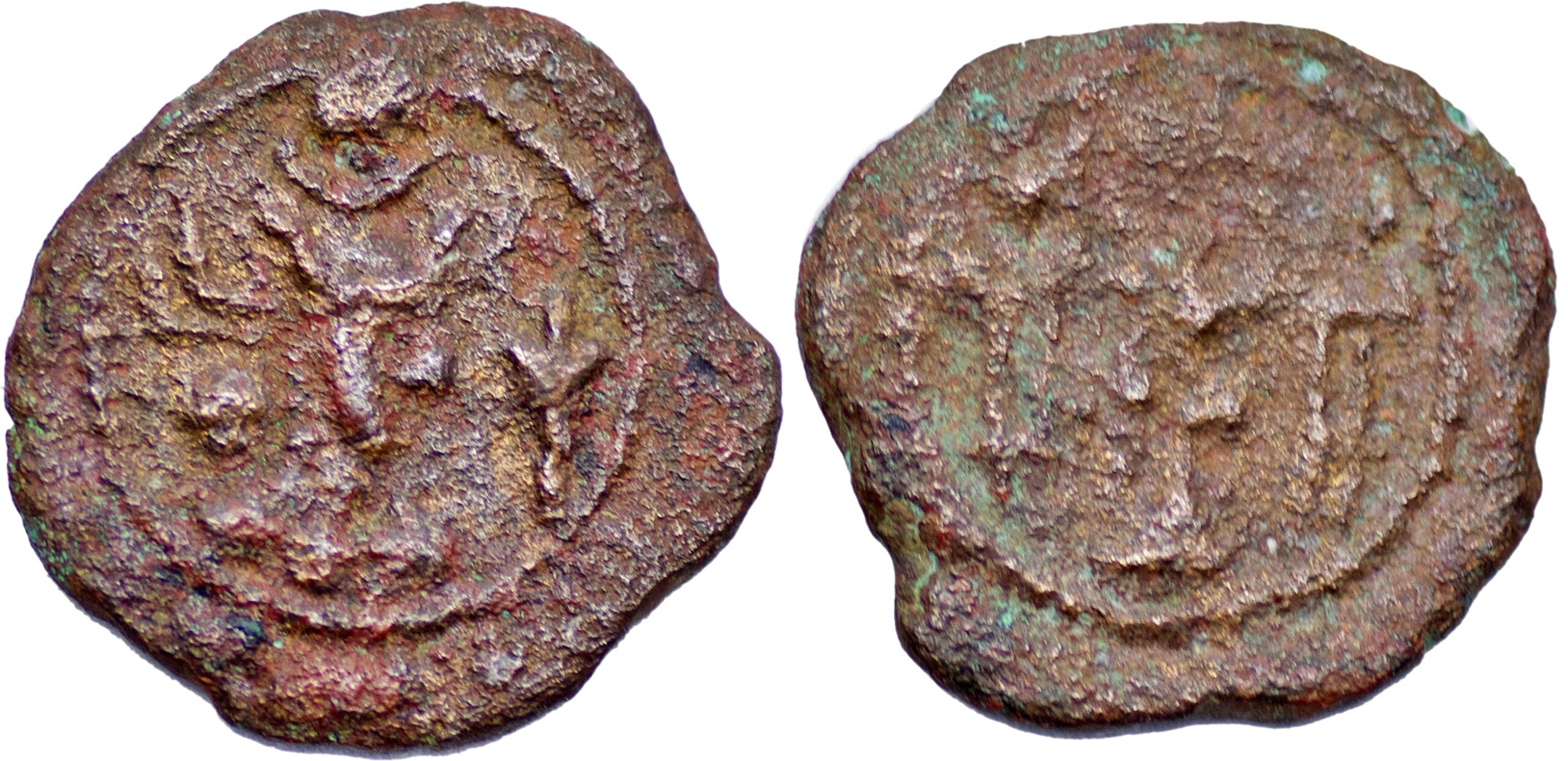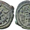 SASANIAN EMPIRE, Vahram V (Varahran), AD 420-438, Æ Pashiz (1.50g/ 15mm ). Vahram’s bust right, undefined Sasanian symbol to right (Flower?) / fire altar with bust right in flames & two attendants. Gobl I/1; Gyselen 158-var. Very fine, original brown patina . Rare.