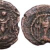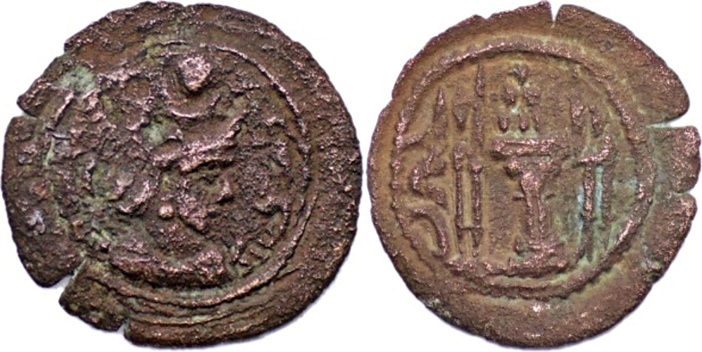 SASANIAN EMPIRE, Vahram V (Varahran), AD 420-438, Æ Pashiz (1.31g/ 18mm). Vahram’s bust right, Scripts to right /fire-altar & two attendants. Gobl I/1. Very rare.