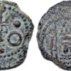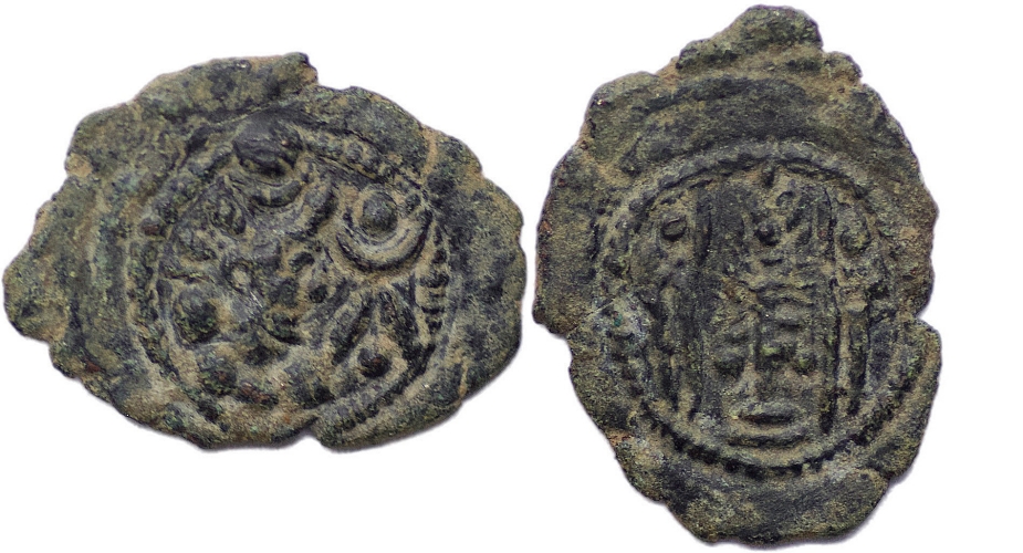 SASANIAN EMPIRE, Vahram V (Varahran), AD. 420-438. Æ Pashiz (1.60 gm; 15 mm). Vahram’s bust right, diadem and crescent to right / fire-altar & two attendants. Gobl I/1. Very rare.Nice original green earthen patina. VF.
