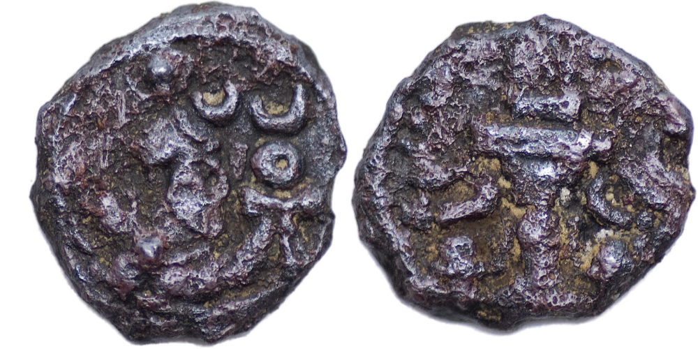 SASANIAN EMPIRE, Yazdgard I, AD. 399-420. AE Pashiz (1.27g/ 16 mm). Bust of Yazdgard I on floral ornament right, wearing mural crown with frontal crescent and korymbos, diadem and crescent in front / Fire altar with diadems. Sunrise -; Saeedi -. Unpublished. Lovely strike. Original Brown Patina Very Fine and Extremely Rare.