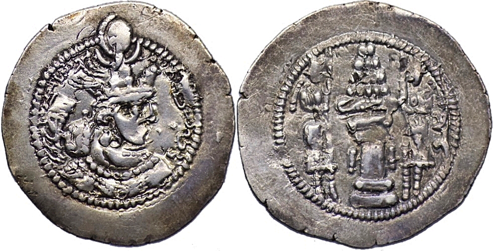 SASANIAN EMPIRE. Yazdgard II, 438-457. Drachm (4.04g/ 30mm), AY? (Eran-Khwarrah-Shapur), Obv: Bust right wearing mural crown Rev: Fire altar flanked by two attendants. Gobl Ib1. Very fine