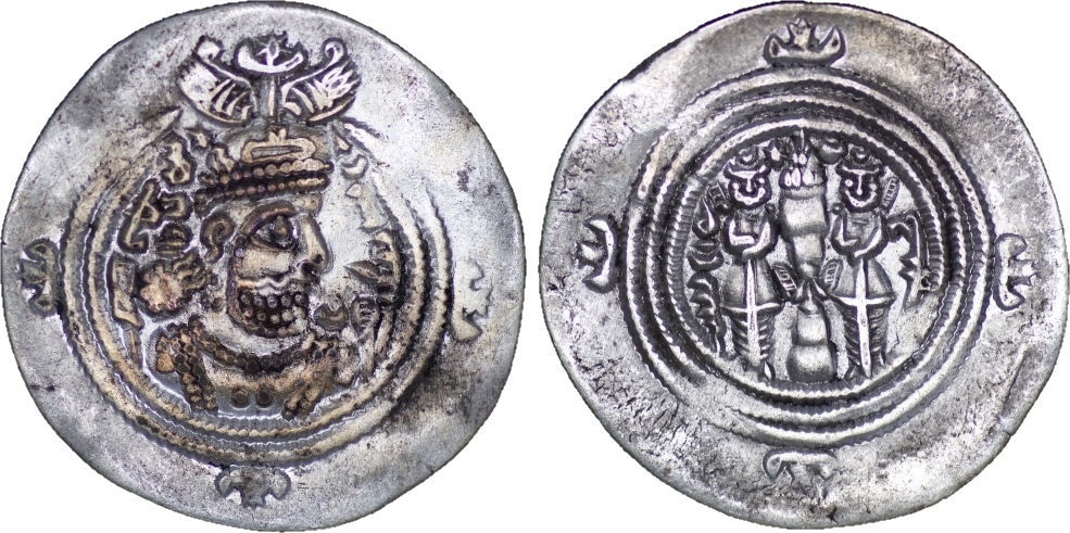 Sasanian Kingdom. Khusrau II AD 590-628 . AR Drachm (3.40g/ 30mm) , DA (Darabgird) Mint, Date 35, Göbl II/3, very fine