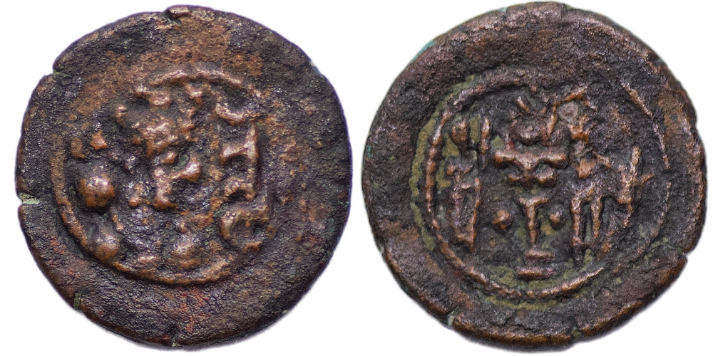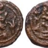 SASANIAN KINGS, Vahram V (Varahran), AD 420-438, Æ Pashiz (2.56 gm; 18 mm). Vahram’s bust right, diadem and crescent to right, WH (Vahram) letters to right / fire altar with bust right in flames & two attendants. Gyselen 158-var; SNS-86. VF. Very Rare.