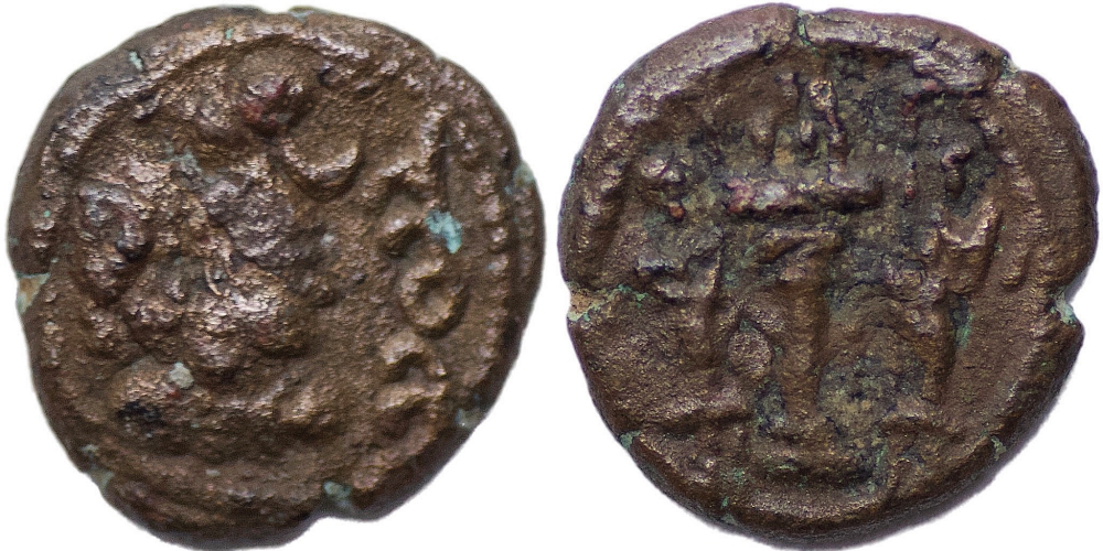 SASANIAN KINGS, Yazdgard I, AD 399-420. AE Pashiz (2.49 gm; 14 mm). ShPH (Eranshahr Shapur) mint. Bust of Yazdgard I on floral ornament right, wearing mural crown with frontal crescent and korymbos, mint name in Pahlavi in front / Fire altar flanked by two attendants. Sunrise -; Saeedi -. Nice brown reddish patina. VF. Very rare.