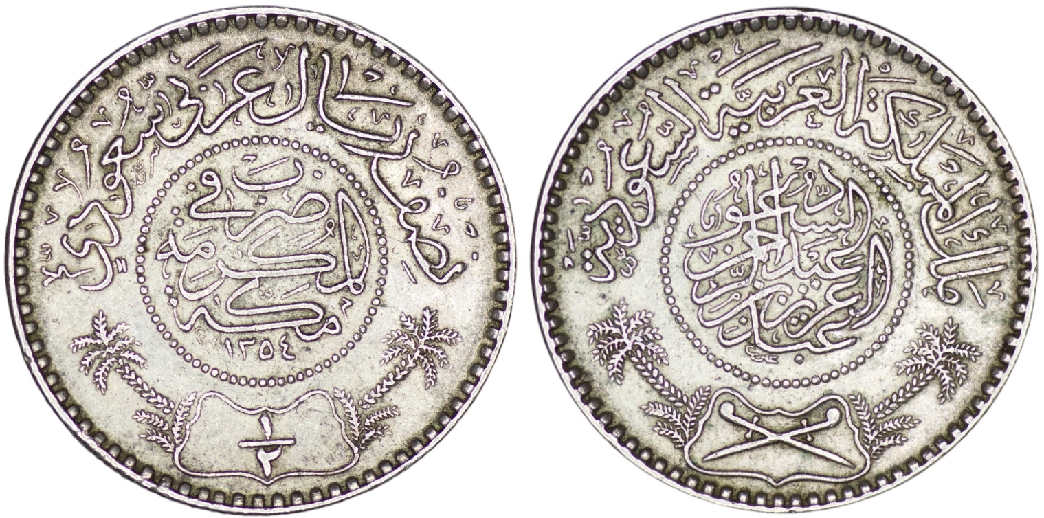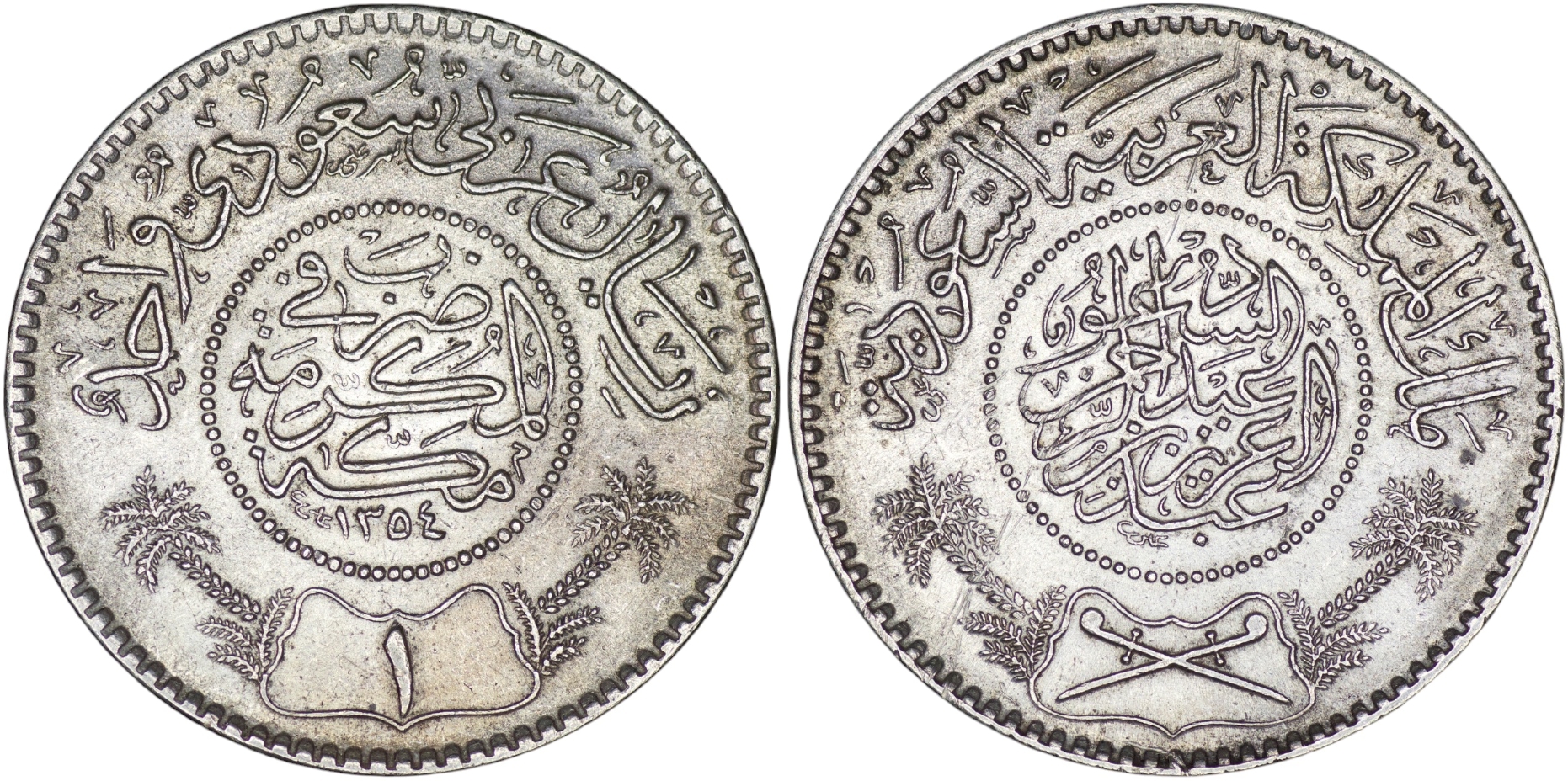 Saudi Arabia. Abdulaziz bin Abdulrahman (1921-1953). Silver 1 Riyal. AH 1354