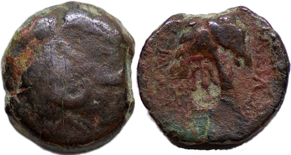 SELEUKID KINGS, Antiochos III ?. 222-187 BC. Æ . Ekbatana mint (2.82g/ 15mm), warn obverse/ Horse head, surcharge on horse chest (Seleucid kingdom symbol), Greek Inscription. RARE.